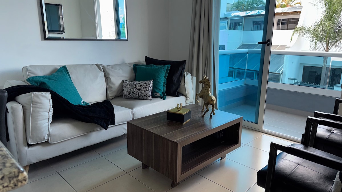 Apartamento Mono_ambiente, una habitación privada con cama Queen que cuenta con un pequeño espacio para cocinar, ubicado en el primer piso del edificio, tipo habitación de hotel pero con su propio espacio privado sin compartir con otros huéspedes. El complejo cuenta con área verde, piscina que es de uso exclusivo únicamente para residentes.