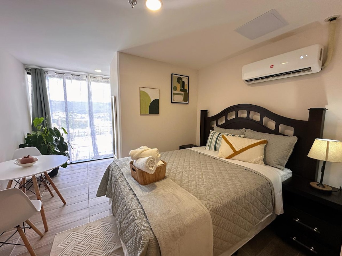 Modern, minimalist studio apartment, perfect for two people. Located in a safe, central area, surrounded by shopping centers, supermarkets, universities, restaurants, sports fields, and churches. Features include air conditioning, fast Wi-Fi, a Smart TV, a fully equipped kitchen, a washer and dryer, hot water, and private parking. The building offers 24/7 security with cameras. Ideal for travelers and digital nomads on short or long stays. Access to Gym for 30 days stays!