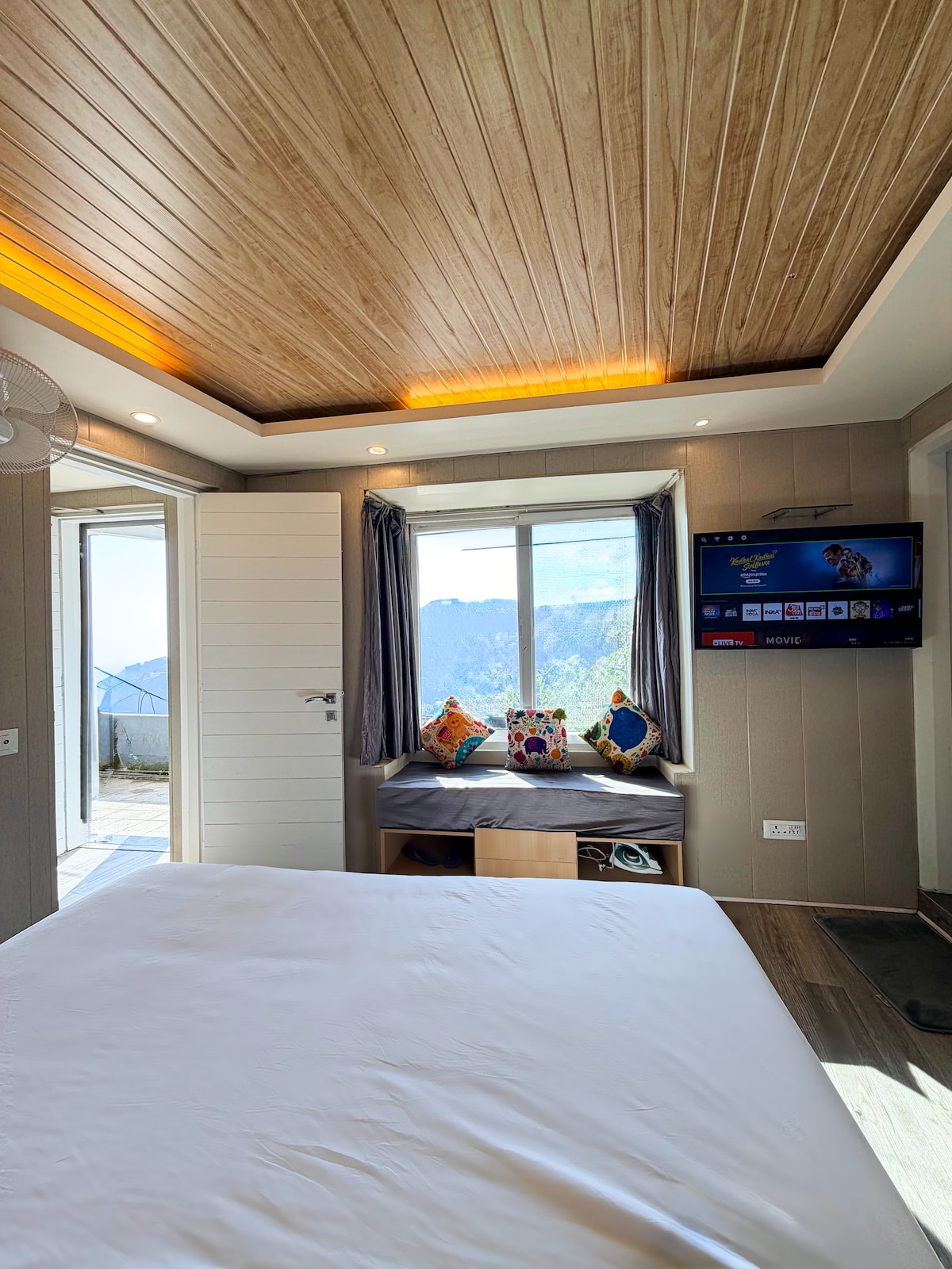 Our 2 BHK is perfectly situated between Mussoorie and Dhanolti, offering access to both while surrounded by serene nature. In winter, enjoy stunning views of the famous Winterline. The property features a spacious living room with a kitchenette, 3 Big LED TV in the living room as well as both the bedrooms, a large balcony with seating, and smaller balconies in each bedroom. Both bathrooms have bathtubs overlooking the valley and mountains, making it a perfect peaceful retreat.