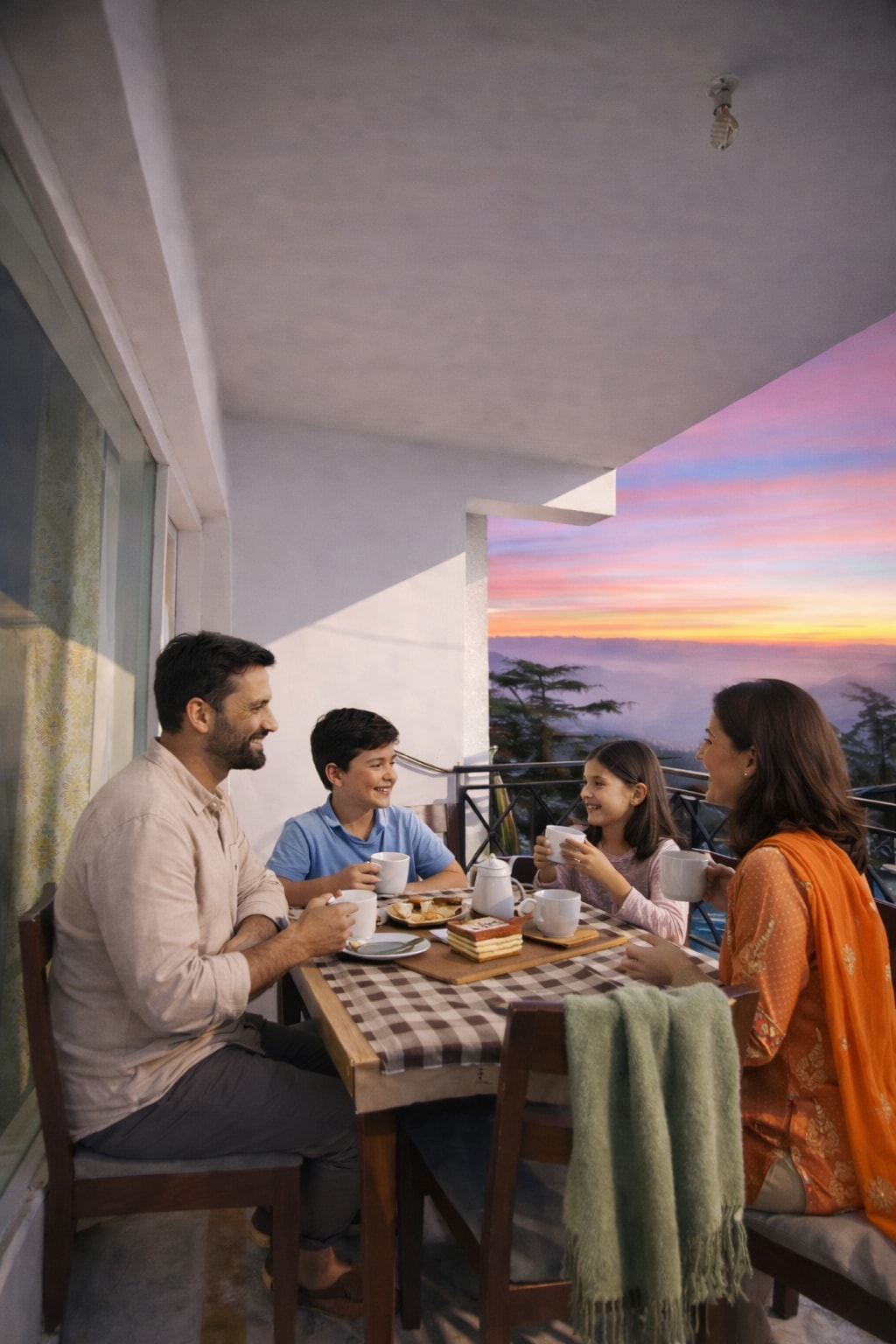 Set along a serene river at a peaceful, pet & senior-citizen friendly resort, this 2-bedroom suite features large glass windows and private balconies that frame picturesque river and mountain views. Outdoors, guests can unwind amid landscaped gardens, riverside seating, a gazebo, a cabana, and a shared pool with a dedicated kids’ pool. Delight in delicious meals at the on-site restro, which offers thoughtfully designed indoor & outdoor seating, ideal for intimate meals immersed in nature.