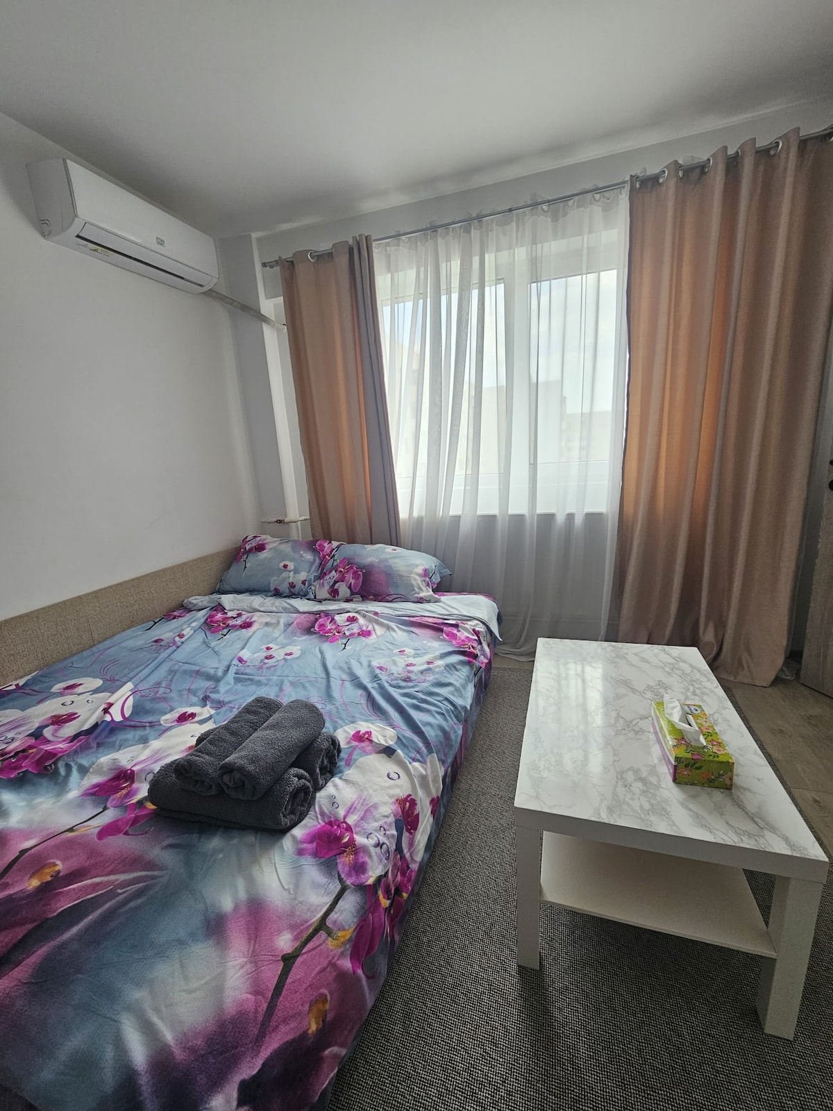 Bright and spacious studio apartment located in a 10 floors building, newly renovated with a fully equipped modern kitchen with an electric hob, integrated fridge and refrigerator, and all other necessary kitchenware for making a gourmet meal. It is placed in a great area with quiet neighbourhood, less than 15 minutes to City Centre, with direct public transportation to the old town, close to a big variety of beautiful parks and lakes such as Tei, Plumbuita, Circului. Free car park available.
