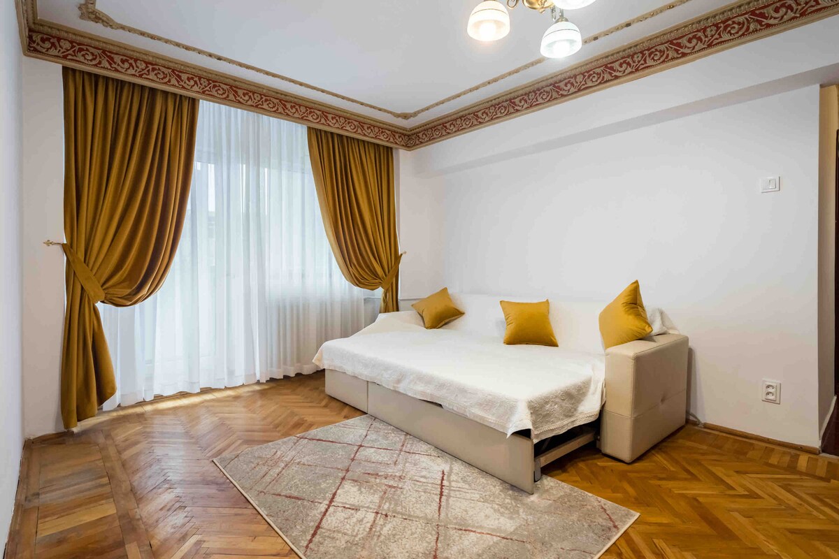 Bright and spacious studio apartment located in a 10 floors building, newly renovated with a fully equipped modern kitchen with an electric hob, integrated fridge and refrigerator, and all other necessary kitchenware for making a gourmet meal. It is placed in a great area with quiet neighbourhood, less than 15 minutes to City Centre, with direct public transportation to the old town, close to a big variety of beautiful parks and lakes such as Tei, Plumbuita, Circului. Free car park available.