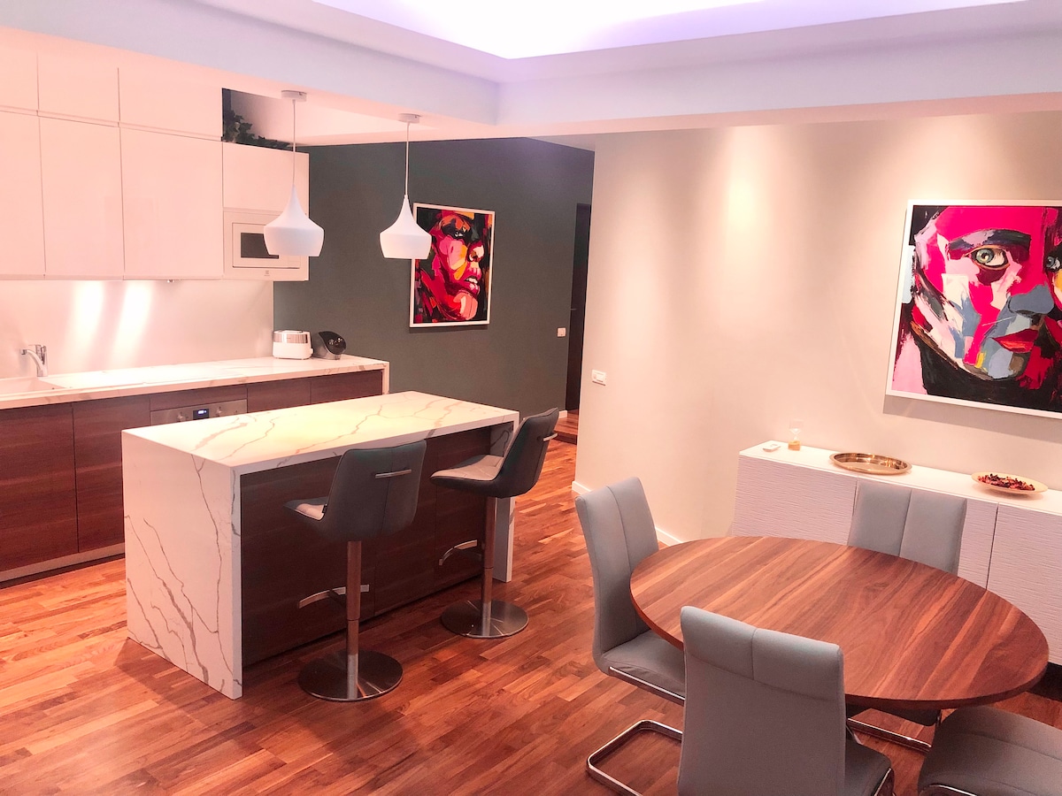 Every home is different and everything you could ever want is here. This premium remarkable apartment is an excelent deal. 2 bedrooms with 160 x 200 beds, 1 livingroom with an extensible couch that can accomodate up to 6 persons, 2 bathrooms with tub. Gym, mall, business district, restaurants, underground metro, fully equipped kitchen, coffee and tea stations, washer & dryer, hairdryer, steam iron, 2 large TV, 3 AC silent units, gas boiler. Free WiFi, free parking, new block. Perfect location.