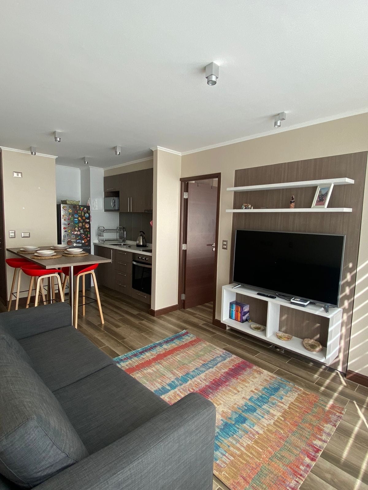 Comfortable apartment, ideal for small families. 1 bedroom, 5th floor with elevator. Fully equipped! Excellent location, steps from the UACh and close to the main attractions of the city. A 10 minute walk to the city center or 5 minutes by car. Public locomotion in front of the building. Supermarket at 500 m, shopping center and the best pubs in Valdivia just around the corner. Ideal for small families. Includes high chair and car seat for children. Enabled for Home Office !!