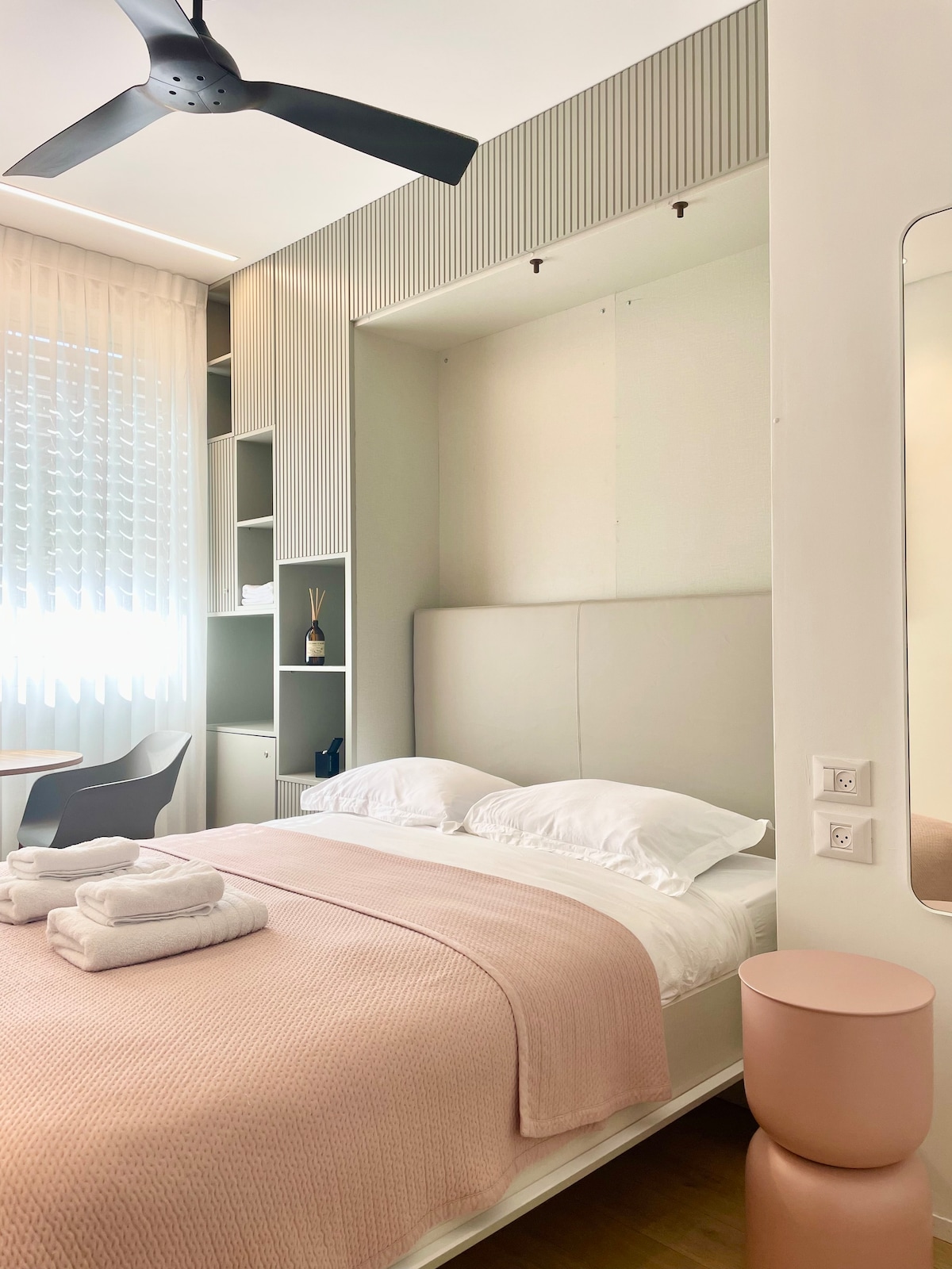 We offer multiple identical apartments in the building! Located in a brand new residential project, steps from the beach and the famous TLV boardwalk. Step out from the building to what is the best location in Israel! The flat overlooks the city from it’s large balcony. There is a spacious space with a bed nook, closets, stand up shower, living room with smart TV, fully equipped kitchen, Nespresso, dining area, AC, washing machine, dryer & more! Parking included with request!