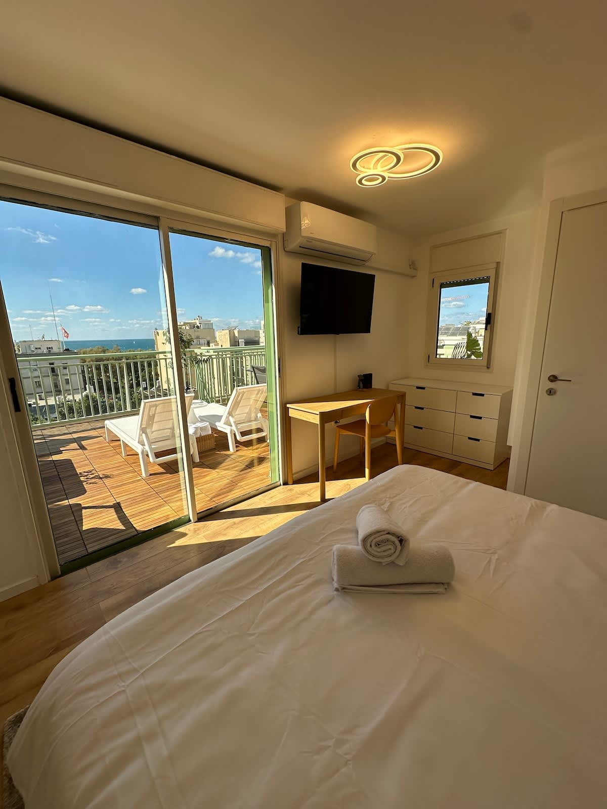We offer multiple identical apartments in the building! Located in a brand new residential project, steps from the beach and the famous TLV boardwalk.Step out from the building to what is the best location in Israel! The flat overlooks the city from it’s large balcony. There is a spacious space with a bed nook, closets, stand up shower, living room with smart TV, fully equipped kitchen, Nespresso, dining area, AC, washing machine, dryer & more! Parking included with request!