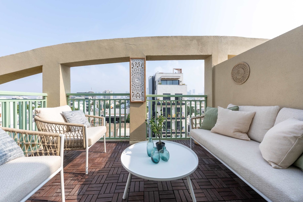 Dream Penthouse in Tel Aviv: Experience Tel Aviv from this stunning 6th-floor penthouse (with elevator). Perfect for families and groups: bright living room, full kitchen, 2 bedrooms, and 2 bathrooms. Every room boasts a private balcony with panoramic city views! Premium Location: Steps from the beach and the best cafes. Comfort: Quiet and central, ideal for strollers and luggage. Family Friendly: Crib available on request.