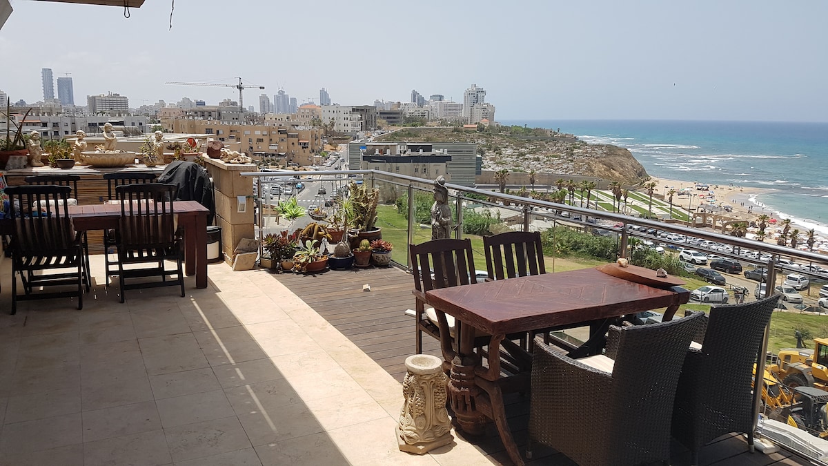 Sea front family penthouse (120m2): modern, private safe, fully air-conditioned, free fast Wi-Fi Beds: ( 2.5 bedroom): King size, Double beds, Queen size, sofa, baby cradle 2 bathrooms: 2 toilets, walk in shower, bath ,inner shelter (mamad), Elegant living room, sofa & leather armchair, equipped kitchen Open air awesome terrace: Jacuzzi (summer), BBQ , dining, Yoga mattresses & swing. Surfing and sea stuff Dining tables (5) & chairs (22) 2 smart TV (NETFLIX, YouTube) Free public parking
