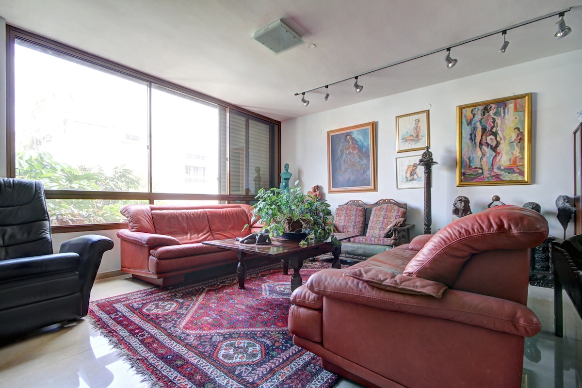 Spacious 2 bedroom + 2 bathroom apartment with a private elevator in downtown TLV. Near cafes and shops, 7 minutes walk from the beach and a dream come true for families and couples. Relax on the balcony, cook in the fully equipped kitchen, feel the city and feel at home. * Covered private parking - we rent parking in an adjacent building for a fee of NIS 100 per day. Must be ordered in advance.