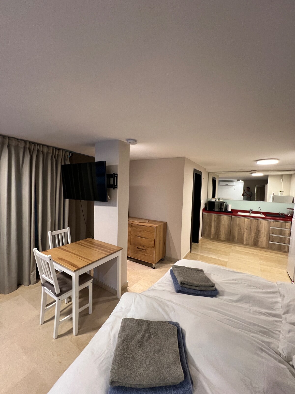 *יש מול דלת הדירה ממ״ק ובנוסף יש מקלט תת קרקעי. בין אם אתם מחפשים מקום לעבוד, לנוח, להירגע, להתפנק או פשוט לברוח מהשגרה — אצלנו תמצאו את הכל. הדירה היא סוויטה מרווחת ונעימה עם מרפסת פרטית הפונה ישירות אל הים, ובמרחק צעדים ספורים בלבד מחוף רחצה מסודר בדירה יש פינת עבודה עם שולחן וכיסא מחשב, Smart TV, ויש גם WI-FI מעולה ללא תוספת תשלום. *הסוויטה מותאמת גם להתארגנות כלה ויש את כל הציוד הנחוץ.