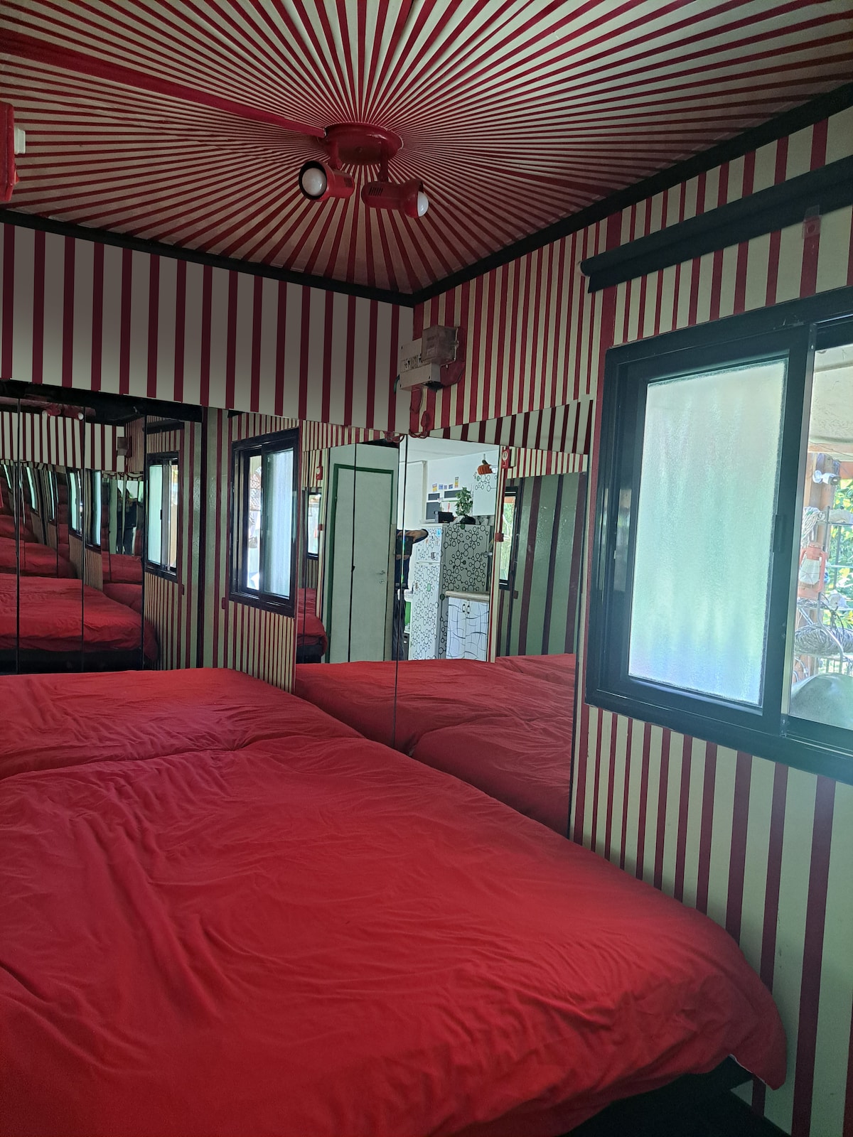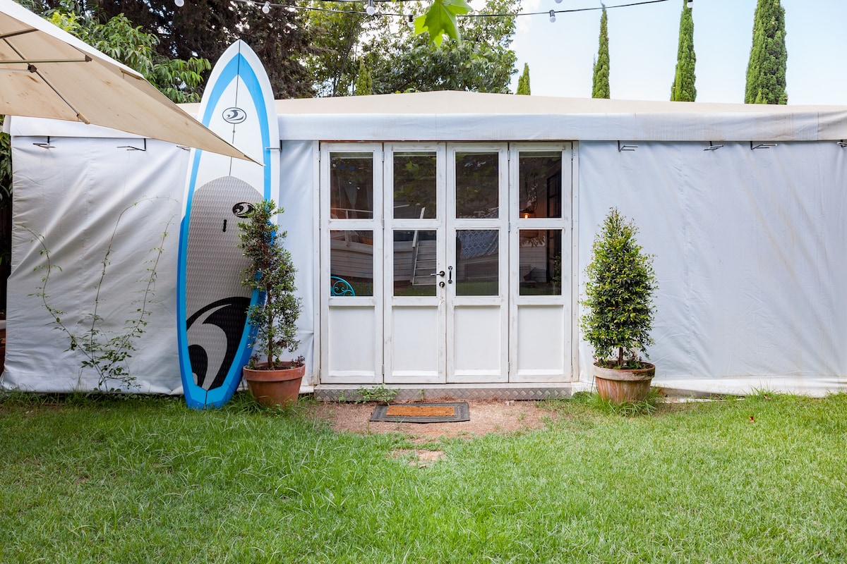 Our place is situated in our 250 sqm garden with an outdoor sitting place. The space is 9*3 metres, 27 sqm, located in a quiet neighberrhood with an easy access to go everywhere. There is a pizza, a supermarket and a grossery store near by. A wide park is in a minute walking distance for jogging and relaxing. Herzliya city center is in a 5 minutes walking distance. The place is decorated as a surfers cabin, the bed mesures are 140/190 cm.