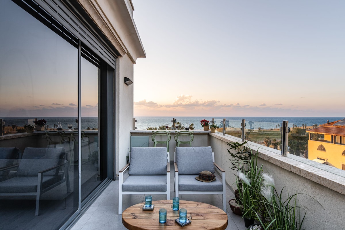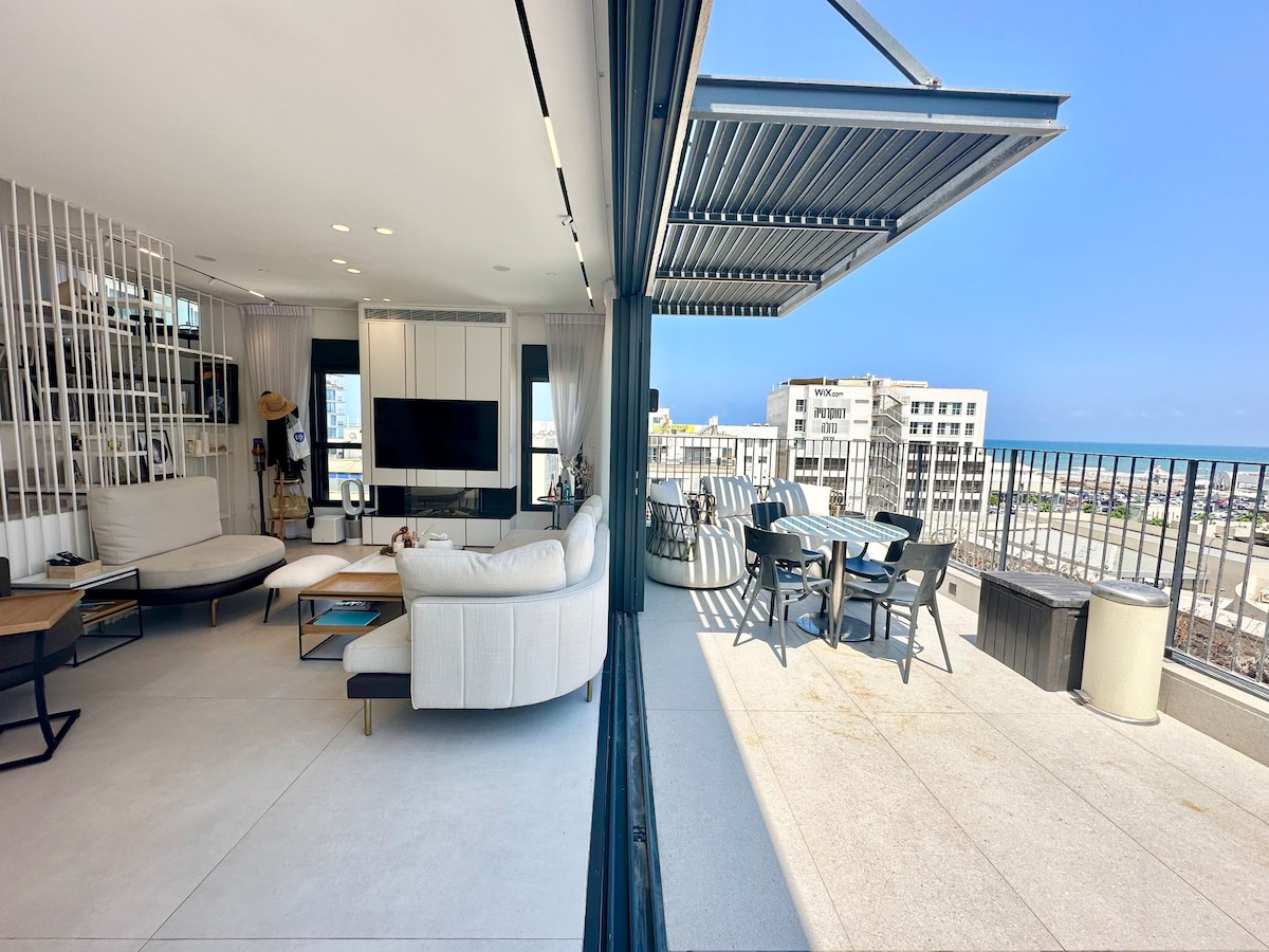 Welcome to this restful stunning hippie chic 3BRduplex luxury penthouse located near the ShukHacarmel and only steps away from Geulabeach! This high-end property is equipped for an unforgettable stay with a huge 180 terrace, the comfiest furnitures and best quality amenities! Enjoy the view, nature, and sea breeze with a glass of wine on the huge terrace, with birds singing as the only sound. Walk 2min to the beach, to explore great spots around the hottest neighborhood of Tel Aviv.