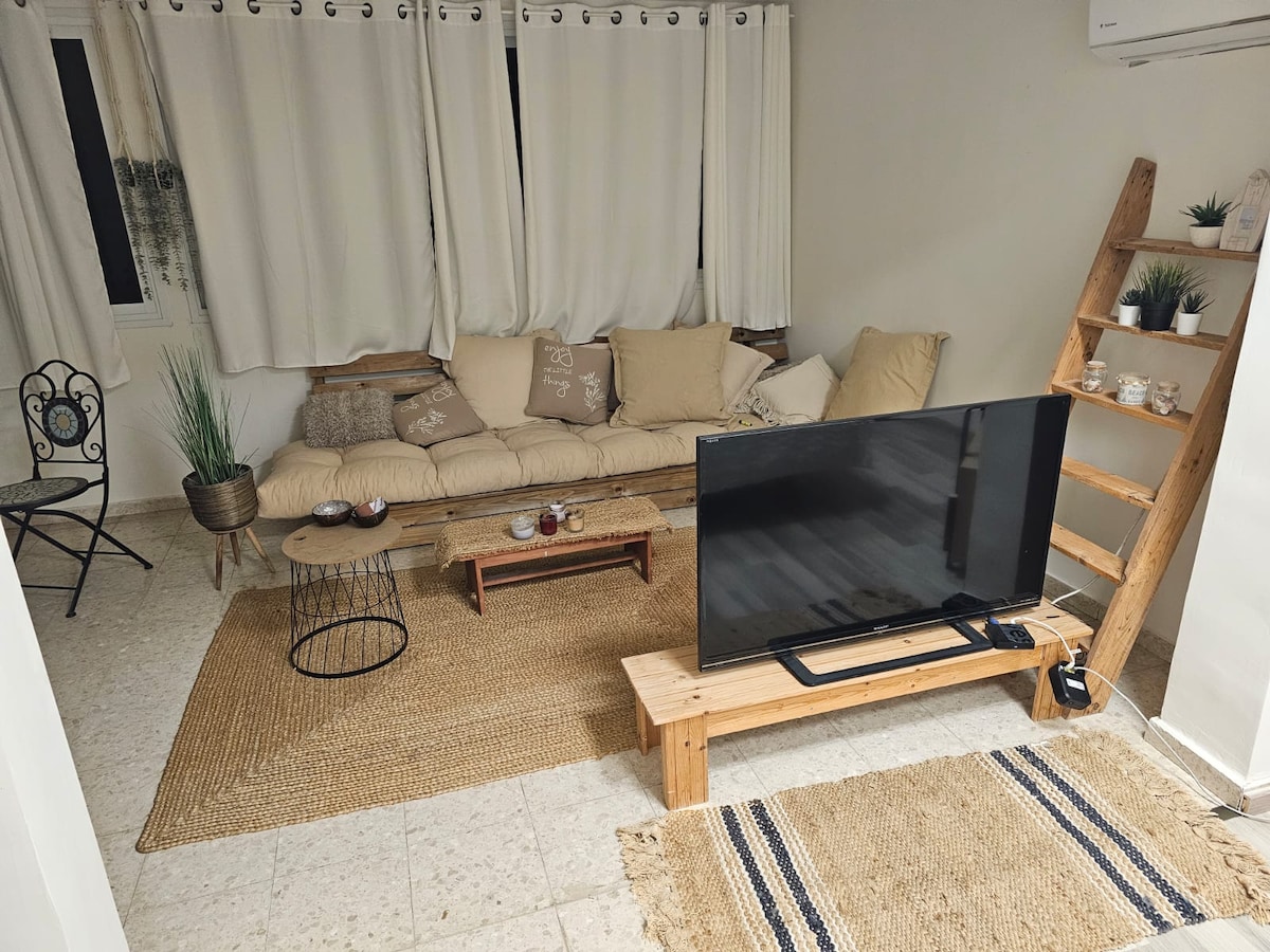 Enjoy our charming, brand-new garden apartment! Featuring two bedrooms (one is a safe room – ממ״ד), a fully equipped kosher kitchen, a spacious living room, and a large private yard with seating area, BBQ, pizza oven, and a small pool. Perfect for couples or families with kids. Sleeping arrangements include a double bed, a pull-out single bed, and a sofa bed. Great location — close to the National Park, Safari, Tel Aviv, public transportation, the light rail, and Shiba Hospital.