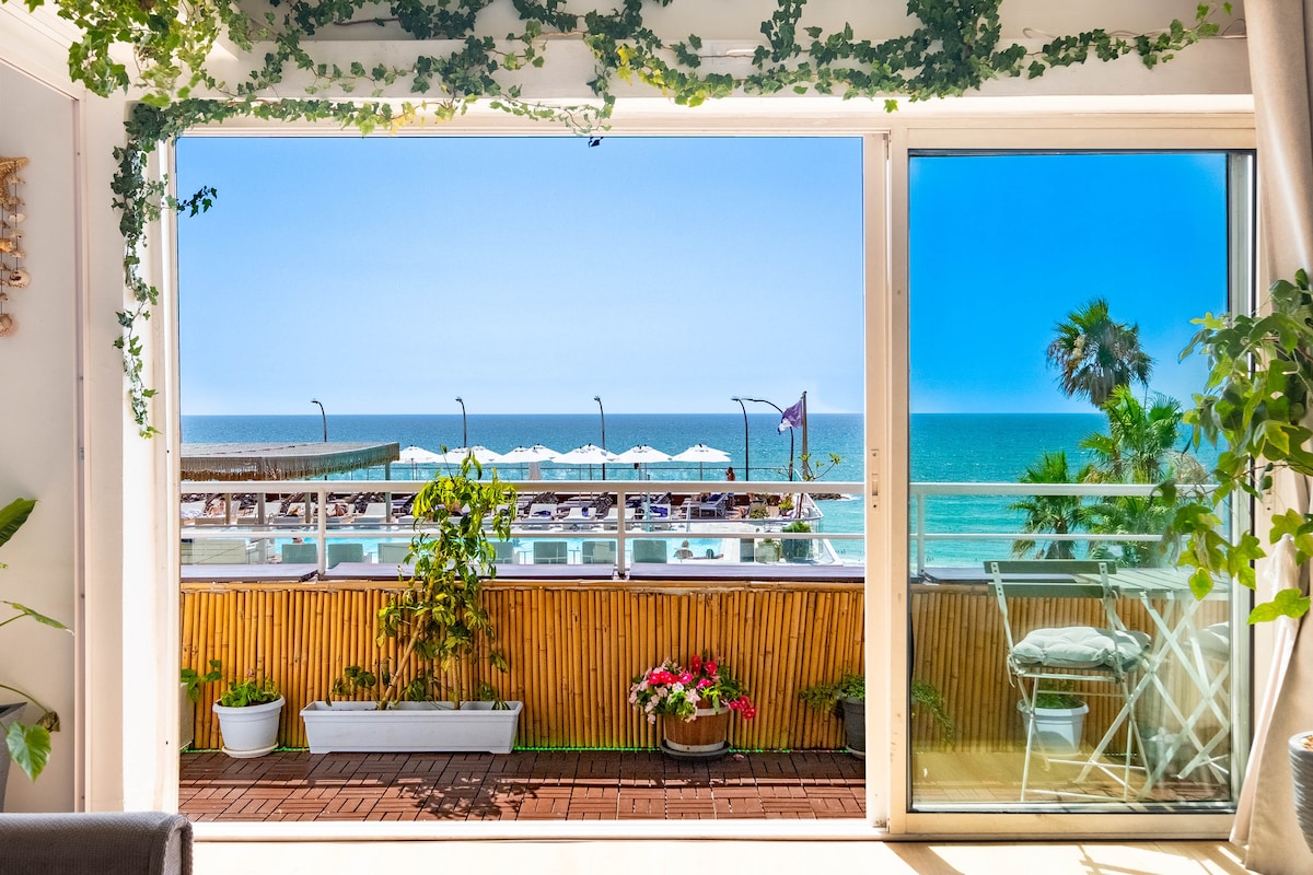 Amazing luxury beach front apartment, located in the best location Tel Aviv has to offer. Steps from the TLV Hotel boardwalk and steps away from the best beaches in the city. The apartment overlooks the sea from it's shaded balcony and offers 2 spacious bedrooms, desk area with a single gallery bed, closets, stand up shower, large tub, pampering living room with 65” TV, fully equipped kitchen; Coffee machine, dining area, AC, washer, dryer and parking! The apartment accommodates up to 5 guests