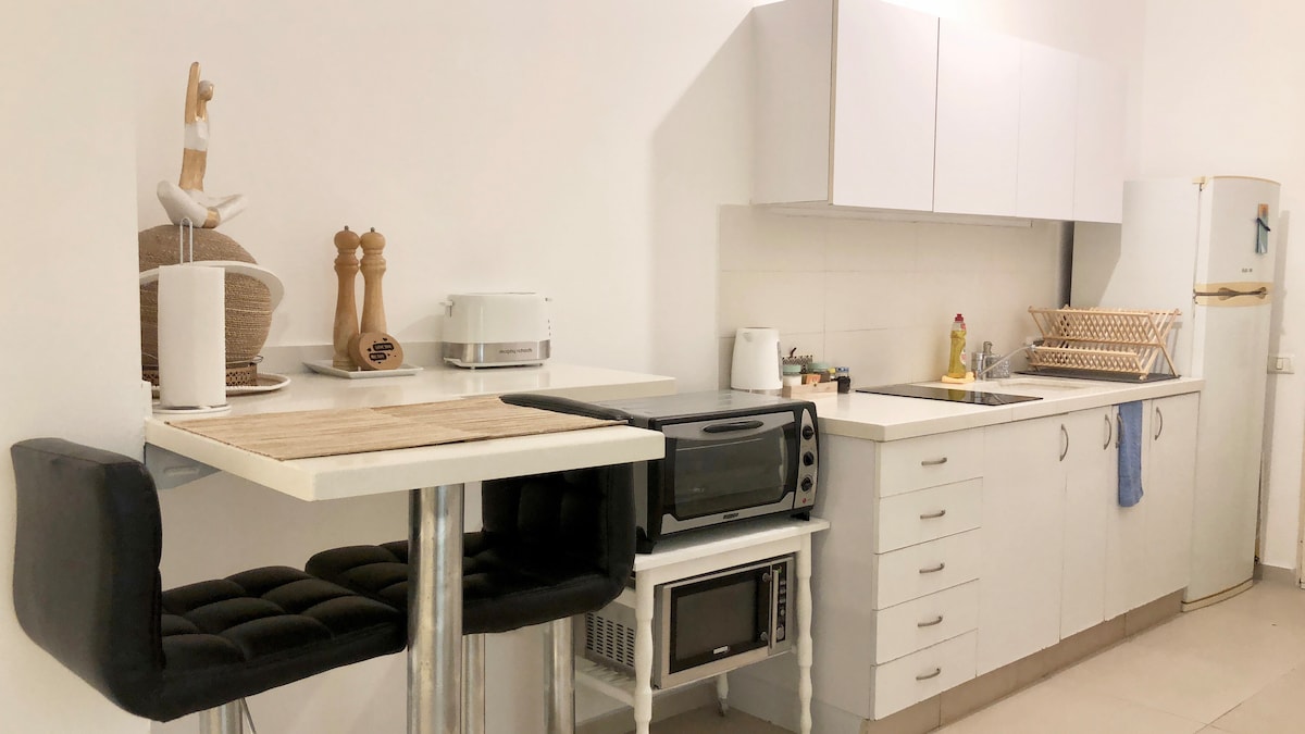 BEAUTIFUL MODERN flat in new group buildings. In Florentine 2 elevators, 1 Shabbat. The apartment is only for you. Efficient and silentfull Air Conditioning with very precise, 1 step degree more or less choice, commands panel. Clear, nice view on sky, and sea, SUPER KING SIZE bed (1,80m wide) very confortable. Pedestrian street, cafes, restaurants, stores, just down the building. Gym space in next building. TIP : Minimum renting is 6 days - 5 nights.