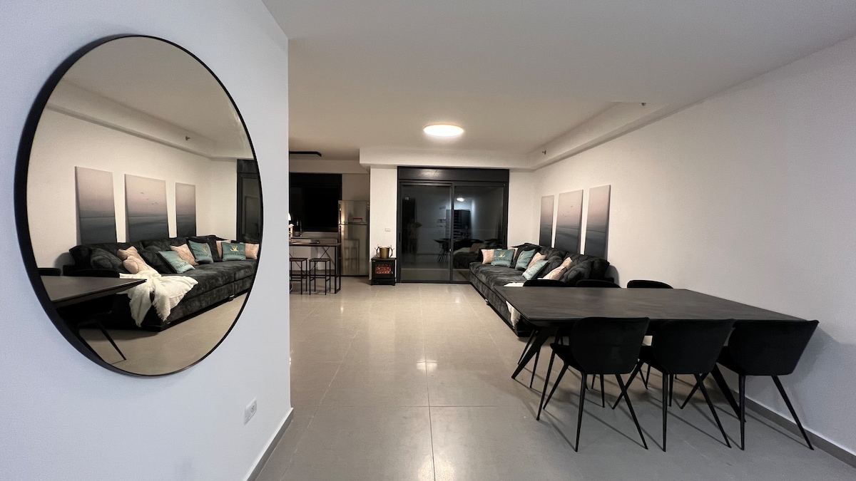 Это стильное жилье идеально подходит для групп и большой семьи. Абсолютно новая 5 комнатная квартира в новом доме! В салоне огромный диван! В каждой комнате есть ТВ.В 3х минутах от пляжа. Остановки и магазины. 500 метров от Тель-Авива. Из окон квартиры потрясающий открытый вид на город и море!