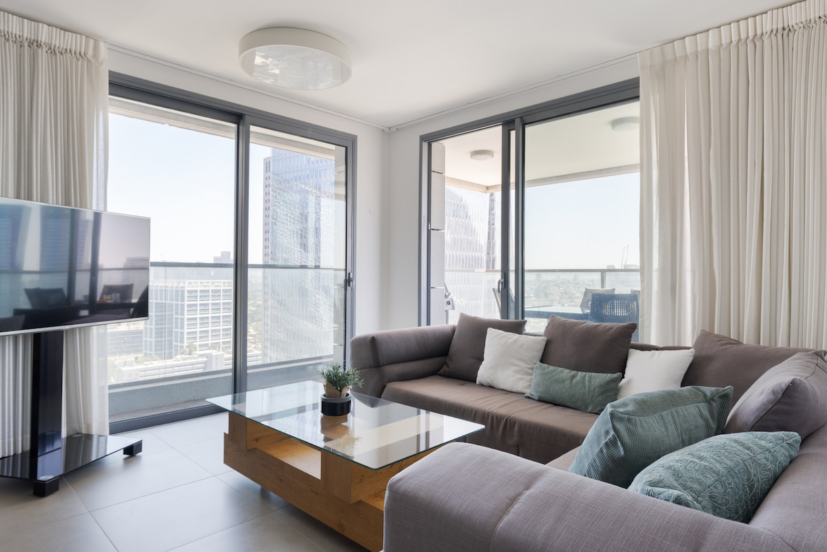 Our luxury apartment will make you feel right at home. Located in the beating heart of Tel Aviv, just minutes away from the Mediterranean Sea. Enjoy a restful stay in a 2 bdr and 2 bathroom apartment with a huge windows that offer spectacular views of the sea and the city and a fully-equipped kitchen. The reception room and terrace of 24m2 invite you to savour moments with family or friends. This apartment is a little heaven of comfort. 24/7 Doorman - WIFI