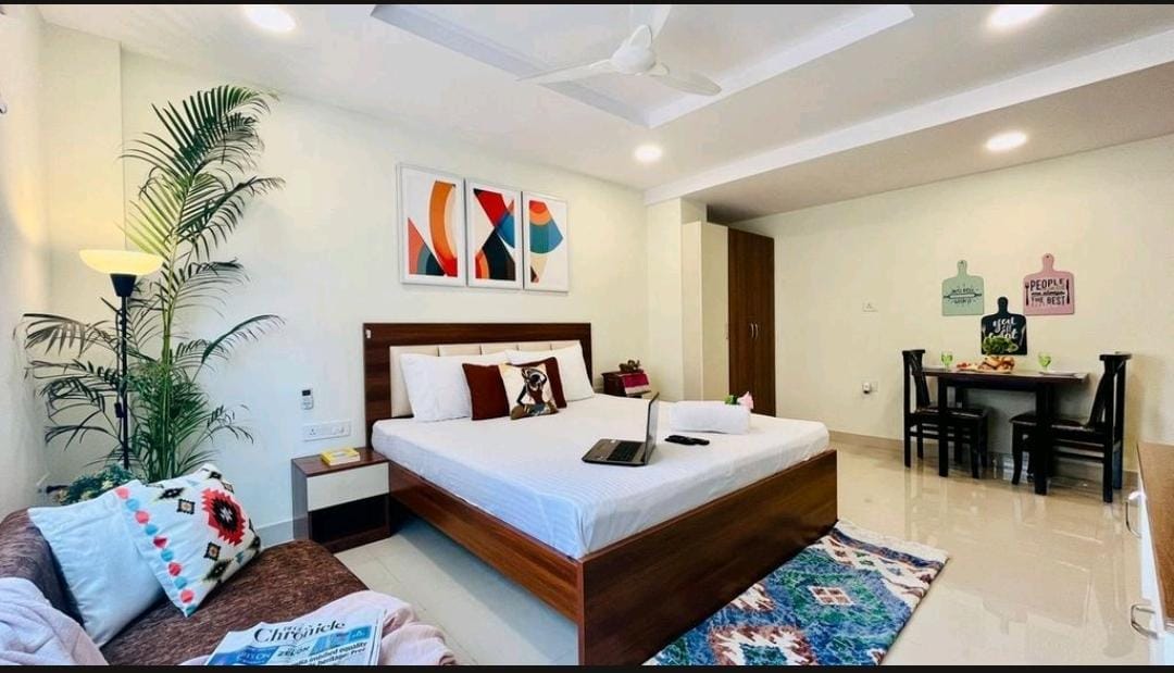* Sanitized Certified * OLIVE Serviced Apartments - Award winning Homes! Designer Private Studio in Gachibowli with Terrace Garden, Parking & Lift, only 5 min from Hitech City, AIG Hospital & Care Hospital Best for Work From Home- King Bed in Bedroom, Work Desk, Bathroom, Couch seating & Dining Table in Living Room & Full Kitchen with Stovetop Gas, Refrigerator, Microwave, cookware etc. All-inclusive Daily Rental- WiFi Internet, TataSky TV, Cleaning,Washing Machine, Utilities, Power Backup.