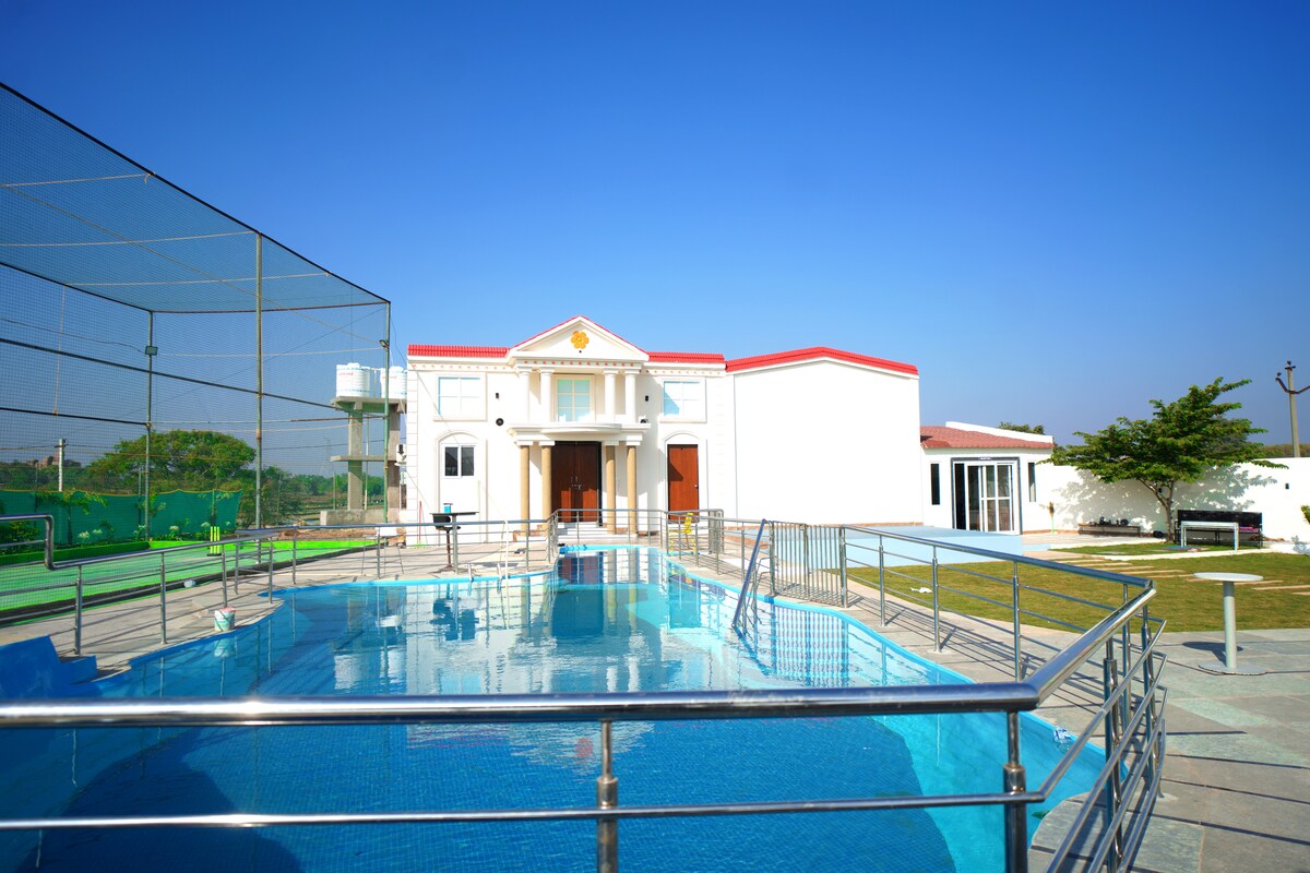 Spacious, elegantly designed duplex farmhouse villa beautifully blends rustic charm with modern sophistication. It features 4 fully furnished bedrooms with attached bathroom, a sparkling swimming pool, a lush green lawn, children play area, adults box cricket and much more to offering the ultimate comfort and relaxation. Please Note: Drinking alcohol strictly prohibited inside the farmhouse.