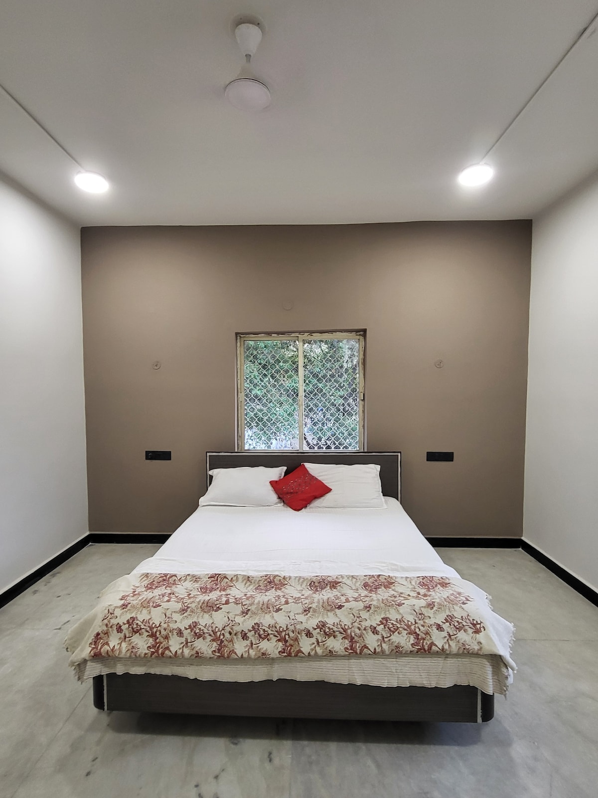 Experience a peaceful stay in this 1 BHK house—ideal for families and small groups. ✨ The Space Compact living hall with a 12" California king memory-foam floor mattress and a 2-seater recliner sofa. Functional kitchen with UV + RO Aquaguard. Master bedroom: Queen-size memory-foam mattress, large wardrobes, attached bathroom and wash basin. One separate (detached) bathroom. 6-seater dining table with wash basin. Non-AC home in winters; air cooler can be provided on request.