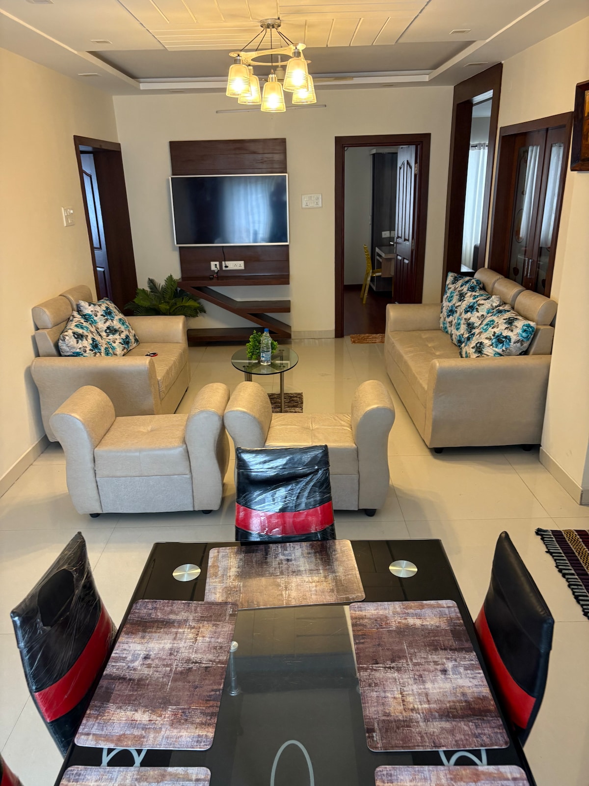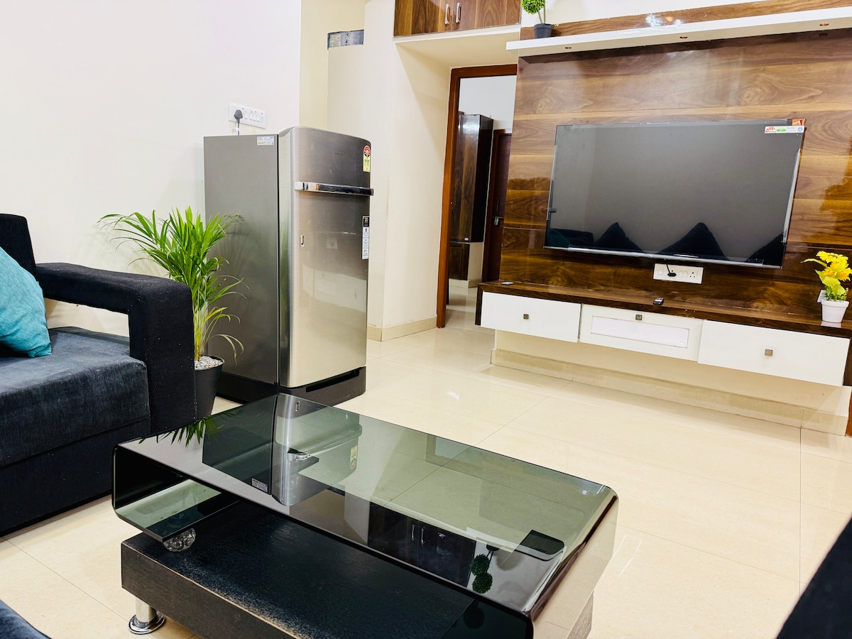 Relax with the Executive and a peaceful place to stay. The centrally located place welcomes you to this 2 bhk Flat. Once inside, the 4k TV and Sofa set in the hall makes it perfect for Movies and relaxation. Seamless WiFi connection is perfect for your work. You have a Simple and useful kitchen and Dining table Leftside Spacious Master bedroom with king-size Bed and second Bedroom has a queen-size bed Both are having attached Bathrooms with air conditioning. Both the Bedrooms have Chilled AC.