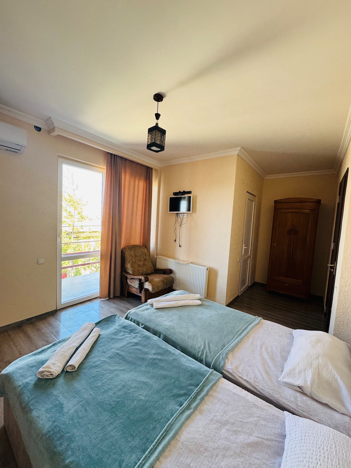A spacious, modern room with a mountain view - wake up in front of the mighty Caucasus. The 20 m² guest room is equipped with a double bed that can also be used as two single beds. The room has an ensuite bathroom. The room, as well as the entire guest house, is very clean, quiet and modern.