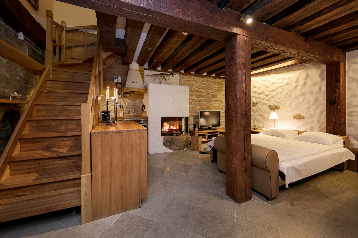 Elegant top-floor apartment with one bedroom and a balcony facing south with a fantastic Old Town view. Ideally located in the hip and popular Kalamaja district, next to the Old Town. Tallinn’s trendiest restaurants, bars and cafés are situated just a few minutes’ walk away. Opposite to the house you will find the best market in Tallinn with fresh groceries, bakeries, a food court etc. One of the nicest restaurants is situated downstairs in the house.