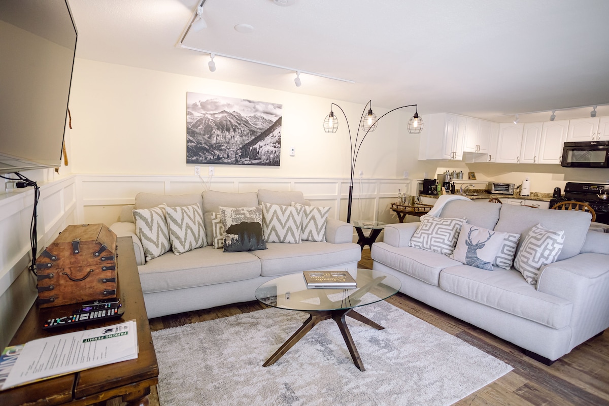 Well-maintained apartment located right in the heart of town, offering privacy and peace while keeping you close to all the action Telluride has to offer. Fully equipped with new kitchen appliances and all the comforts of home. Situated on a quiet street with sunset viewsoverlooking the high school ball field. Enjoy hot tub access from the deck, complete with complimentary robes. Free parking, washer/dryer combo, full amenities, and thoughtfully curated decor for a cozy, beautiful stay. #018108