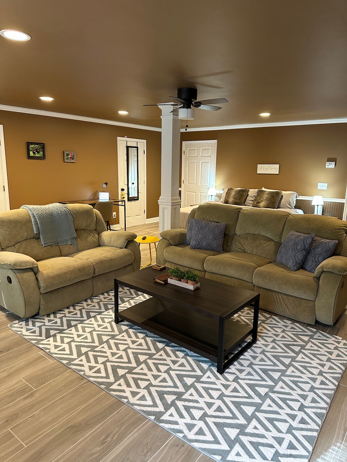 Cozy up at Little Farm at the foothills of the Appalachians. Perfect for couples and traveling professionals, our private walkout basement has a separate driveway and entrance, king size bed and full bath. Comfy reclining loveseat and sofa, 70” HD smart TV with sound bar with Netflix and Amazon Prime, WIFI, refrigerator, microwave, coffee bar with Keurig Coffee Maker, and bistro table. Outside enjoy the Little Farm views of our flock under gorgeous Magnolia complete with fire pit and glider.