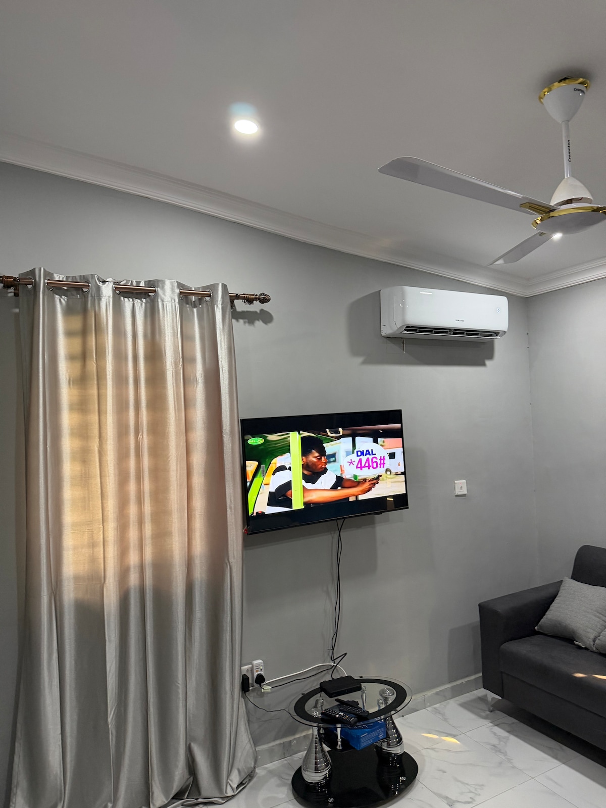 Welcome to your home away from home in Tema Community 3 - a purpose-built Airbnb designed with your comfort and security. Located just 35-minute drive from Kotoka International Airport, this serene property offers a secure environment with CCTV surveillance and an on-site manager Highlights: 3 En-suite Bedrooms — Each room is furnished with a plush queen-size bed 75" Smart TV in the living area 40" TVs in two of the bedrooms. Wi-Fi A/c & Ceiling Fans Fully Equipped Kitchen Free Parking