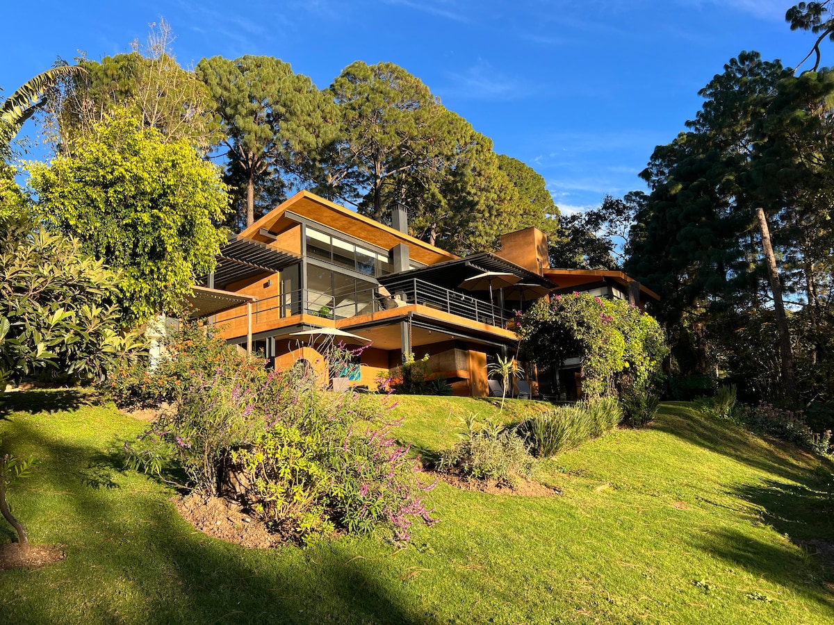 Casa con vista al lago y a las montañas, en medio del bosque, con un jardín propio de 5,000 m2, alberca privada con calefacción y gimnasio privado; ubicada en un fraccionamiento con seguridad las 24 hrs. Diseño arquitectónico en desniveles con techos altos a dos aguas, vigas y columnas de madera, teja roja, barro y madera. Decoración con elementos tradicionales de una casa mexicana contemporánea. Excepcionalmente iluminada con vistas al bosque y jardines desde cualquier ventana.