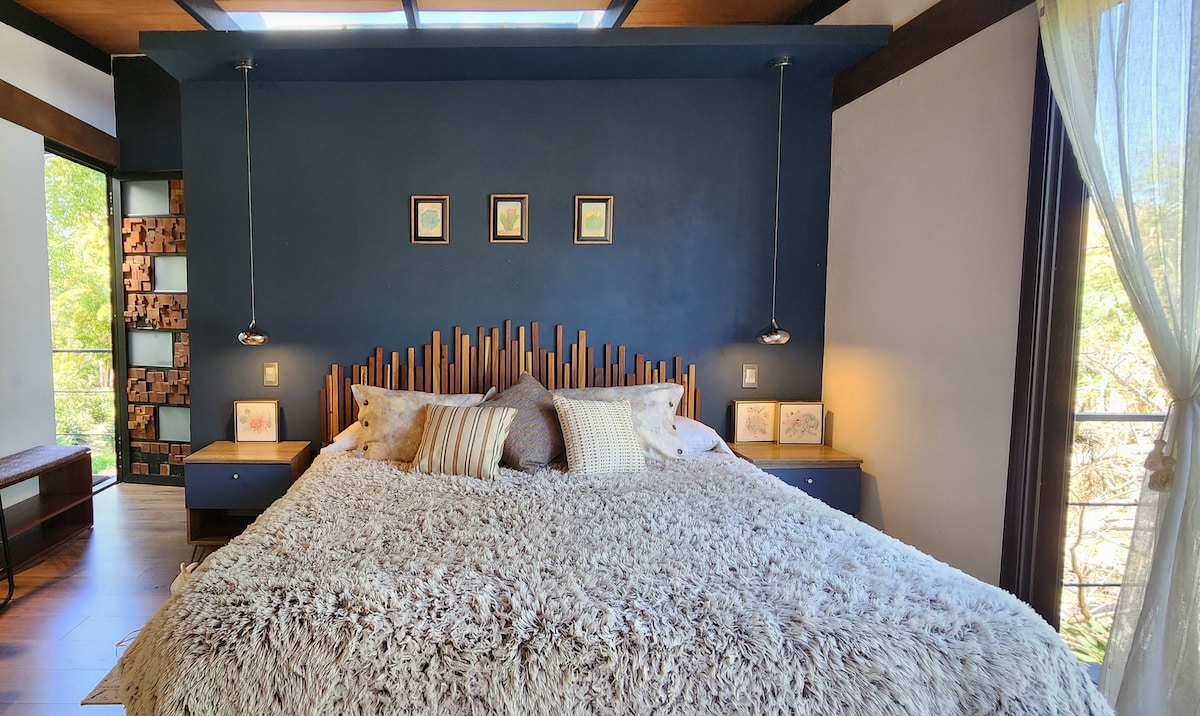 Acogedora habitación en primera planta, estilo cabaña con baño completo, cama king, smart tv, wifi. Rodeada de un gran jardín con fire pit, parrilla, mesa exterior, bioestanque y colindancia con rio tizates emblemático de Valle.