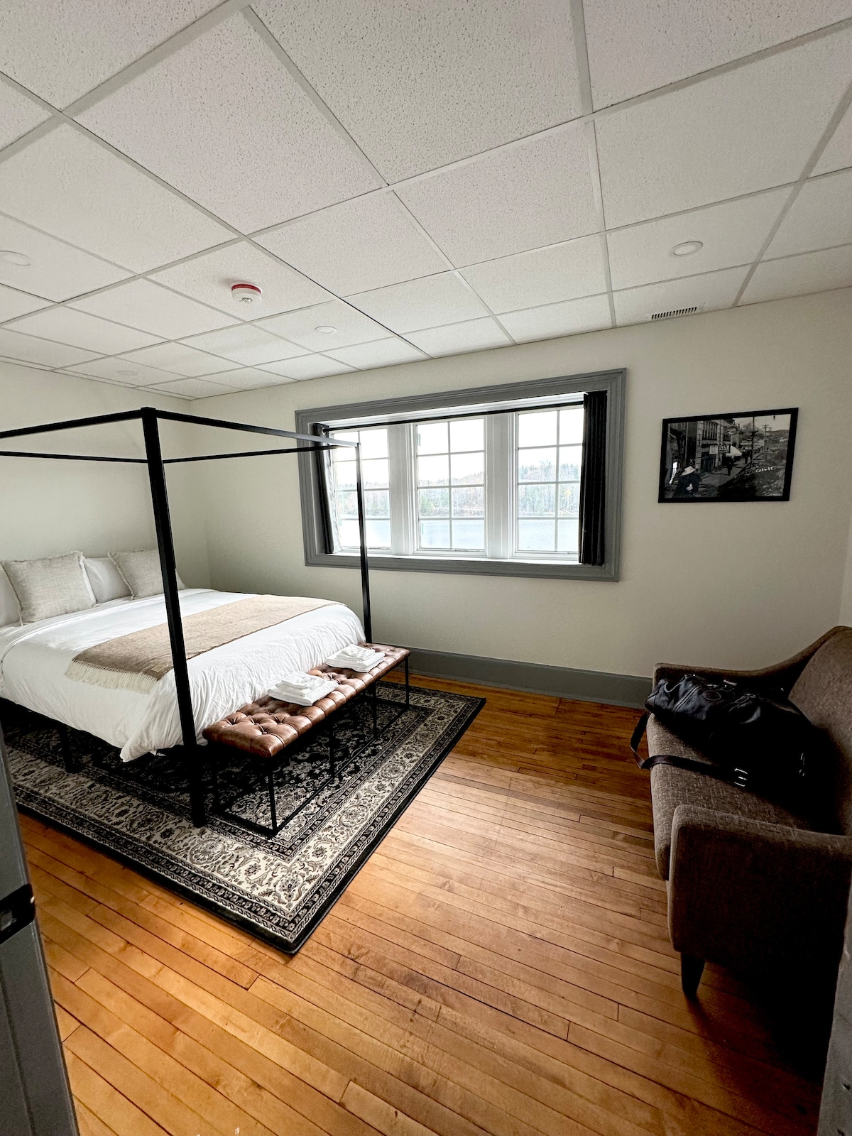 Forget your worries in this spacious and serene space. Enjoy the water views while you relax in this beautiful, clean, new, modern apartment. This apartment is perfect for an executive stay.  Perfect for doctors, nurses, etc. 15 mins driving distance to new Liskeard hospital. This is the lower level unit in a larger home. It is self-contained, with a separate entrance. The unit does not have access to the yard, the firepit, or the dock.