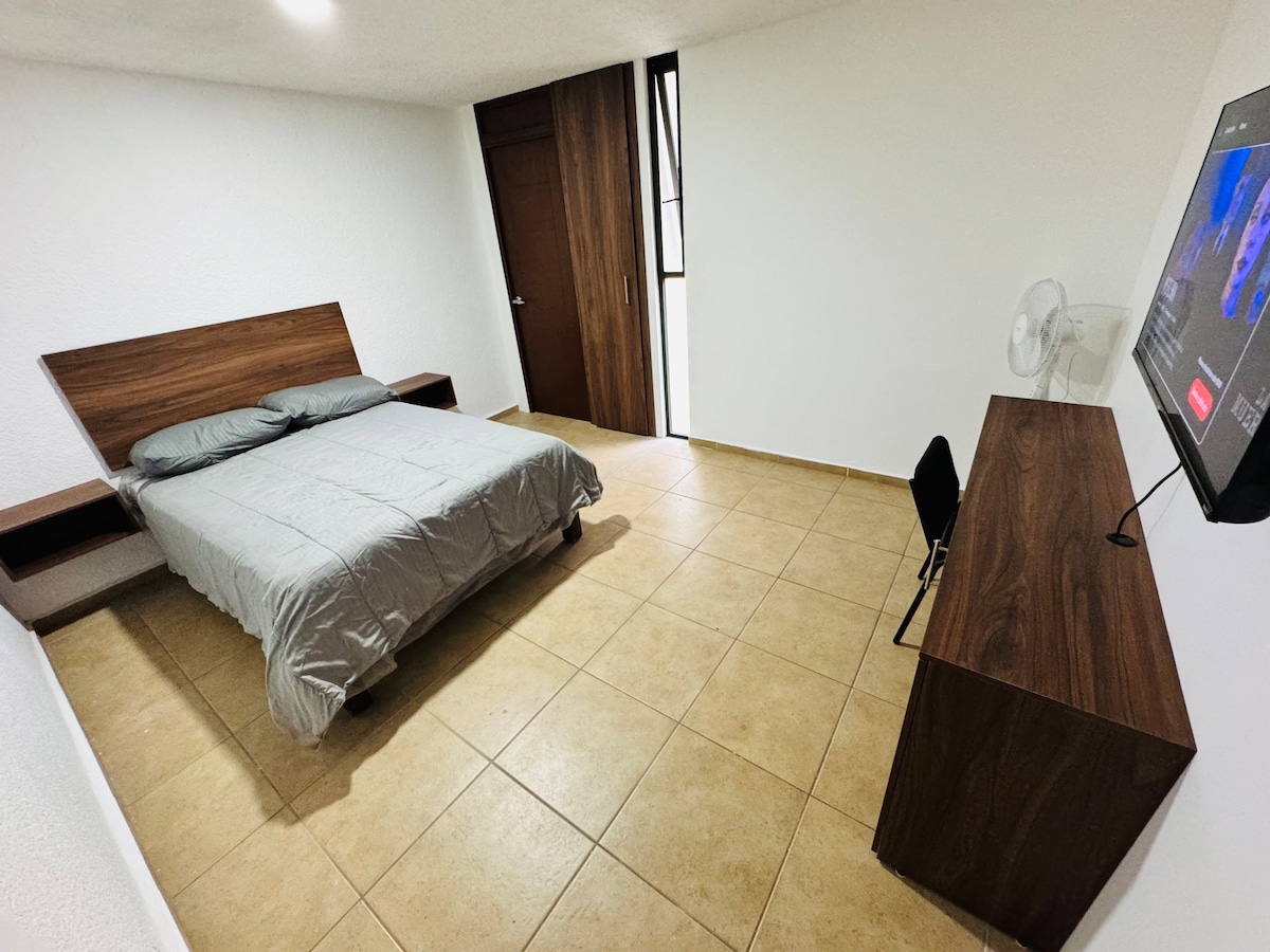 Es un bonito y cómodo apartamento independiente hasta para tres personas, que es parte de una linda casa estilo rústico mexicano con un gran jardín arbolado, cerca del bosque. Son bienvenidas familias, parejas, amigos, o ejecutivos en tránsito. No se aceptan mascotas ya que en casa tenemos un perro y dos gatos. Cerca también encuentra deliciosos restaurantes con diferentes tipos de comida, tiendas de abarrotes, fruterías, farmacia, lavandería, etc.