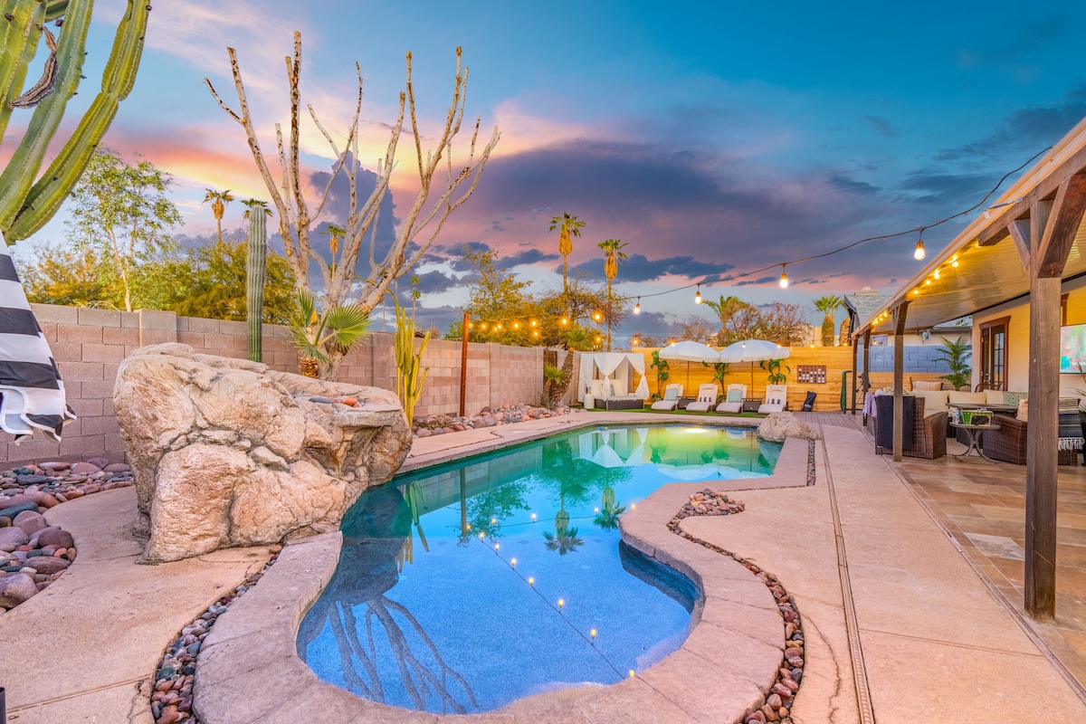 Discover the pinnacle of Tempe's luxury living in this exquisite 3-bed, 2-bath, 1,660 sq. ft haven. Recently remodeled, it features chic interiors with a billiards table, 58' inch Smart TVs, & a modern kitchen with stainless steel appliances. Outside, indulge in the self-cleaning saltwater pool, hot tub, & a full motion patio Smart TV. With its convenient location, just a short 10-min drive to the airport, exploring Tempe and Scottsdale's attractions is effortless from this central retreat.
