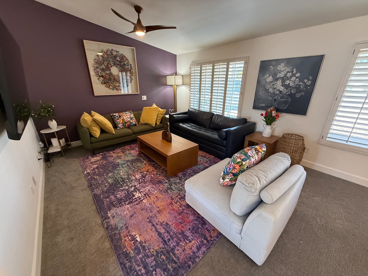 Welcome to Tempe! This 2BR/1BA home has everything you need for a relaxing stay. Fully equipped with dimmable smart lighting and speakers in every room, with a recently remodeled kitchen and bathroom that boasts a spa-like experience in the soak tub, in-unit laundry, high speed internet, 86in 4K TV (all major streaming and 300+ movie collection, with 5.1.4 surround) included and a private back yard, this home is perfect for either a quick trip to the city, movie night, or backyard daycation!