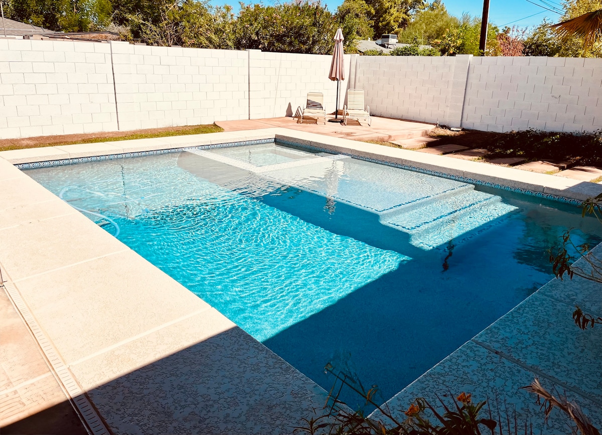 This unique stay is great for those who want to relax or work while exploring central Tempe. The main feature is a pool (heated) with an outdoor shower. The house has 3 rooms (1 king, 1 queen, 1 twin daybed with a twin trundle that lays flat on the ground). There are two desks for those who want to work remotely . We are located 10 minutes drive from ASU and Mill Avenue (downtown Tempe). South Mountain < 10 minutes away, Sky Harbor Airport <15 minutes. No more than 6 guests at the house.