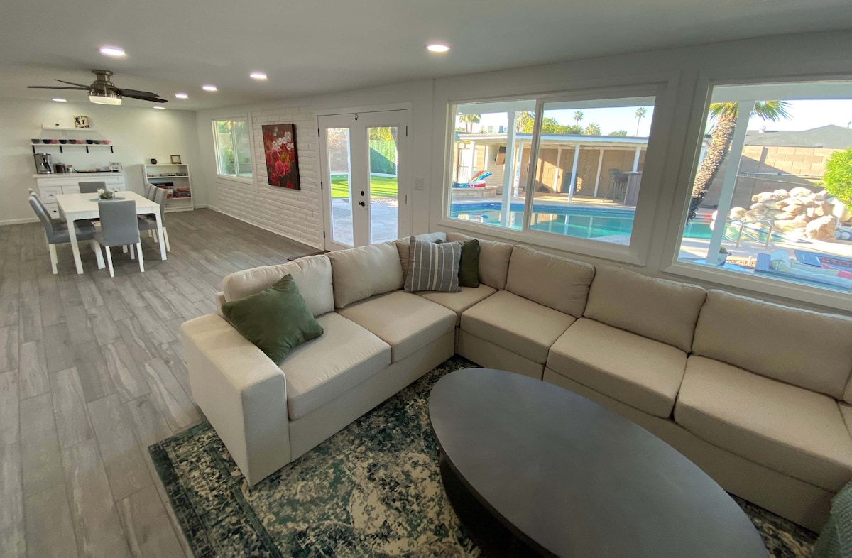 Newly remodeled home featuring a huge kitchen and living area, Beautyrest mattresses, and plenty of room for everyone! The backyard oasis: FREE heated pool, cabana seating 12, pool floats, plenty of lounge space, turf and shade tree. Elevate your experience by hiring a private hibachi chef! - Well-stocked and carefully maintained - Smart TVs in every bedroom - 4 min walk to a grocery store with Starbucks - 5 min ride to Old Town dining and nightlife - Walking distance to local restaurants