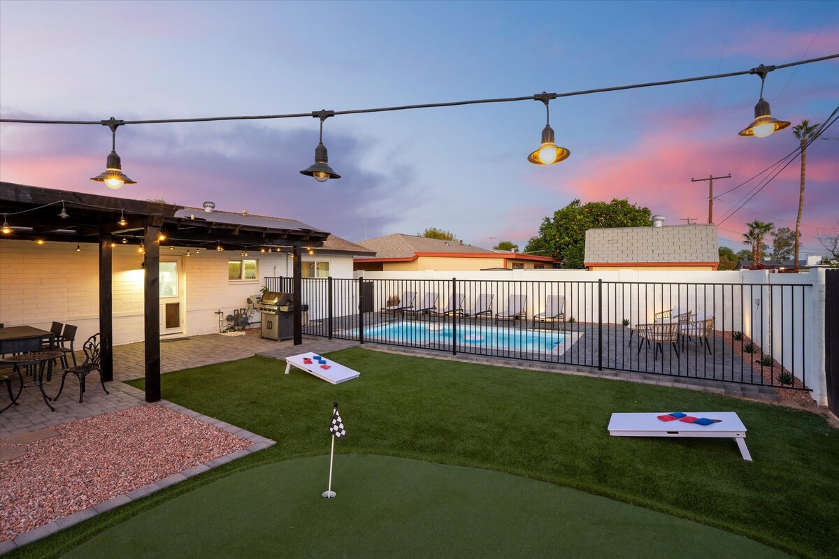 Conveniently located just 1 block south of Scottsdale in Tempe, this vacation rental offers a 3-bed, 2-bath, 1,650 sq ft single-family home with a vast fully enclosed backyard featuring synthetic grass throughout, a 6-hole undulated putting green, a 6-seater hot tub, a 4-burner Weber BBQ grill, & a pool area that offers resort-like lounge seating for 6+ guests. Every room features an LED smart TV, while a 65-inch LG TV hangs on the back patio ensuring our guests with ultimate entertainment.
