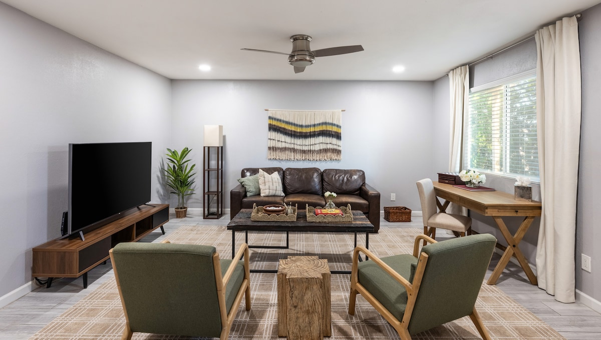 Craving a sun-soaked Arizona escape with all the comforts of home? Look no farther! This modern Tempe gem is perfect for any length of stay and any traveller taste. Indulge in the tranquil calm and privacy of this haven, ideally situated near ASU, Scottsdale, dining, golfing, hiking, and more. Revel in the comforts of a plush king bed, 55" smart TV, fully-stocked kitchen, cozy hot tub, radiant outdoor fire pit, & propane grill. Book today and bask in total serenity.