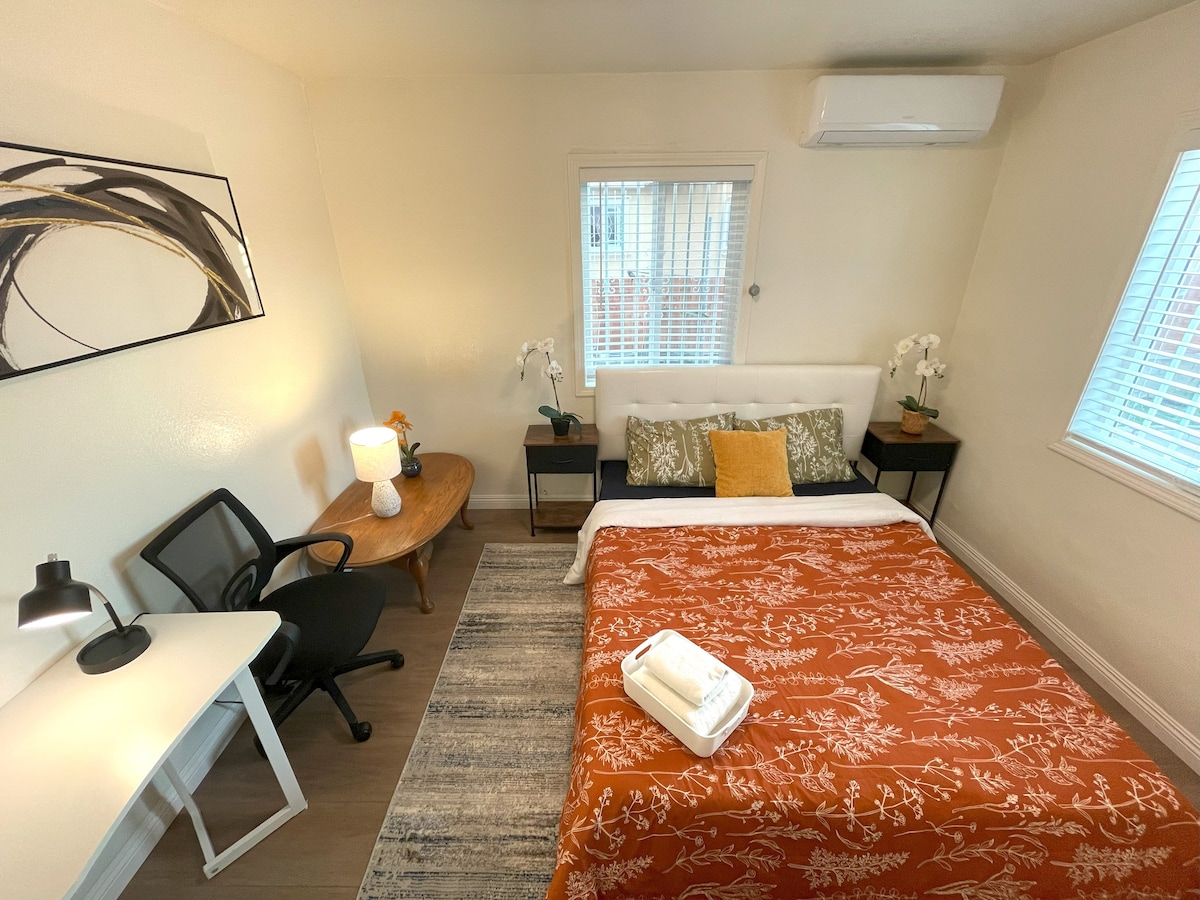 Cozy private studio in the heart of El Monte with modern design and thoughtful amenities. Enjoy a comfy queen bed, smart TV, WiFi, and kitchenette with coffee/tea. Centrally located near freeways- reach LA, Pasadena, and Arcadia in 25 minutes. Quiet neighborhood with easy parking, private entrance, and essentials provided. Perfect for couples, solo travelers, or professionals seeking comfort, convenience, and a relaxing stay.