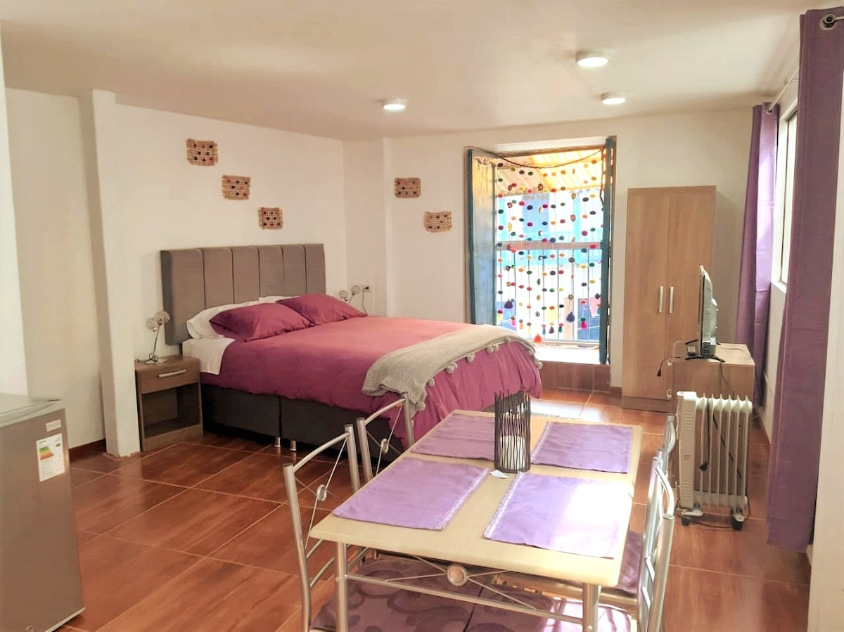 Do you want to be comfortable and enjoy an incredible view of the city of Cusco? charming fully furnished apartments in a restored colonial house in San Blas. Pedestrian street in the heart of the city center and close to everything: 5 min Plaza de Armas, markets, restaurants, bars and historical places. The apartment offers wifi-cable tv-equipped kitchen-dining room and living room-private bathroom- and a huge bedroom with balconies with a magical view of the city of Colonial Cusco.