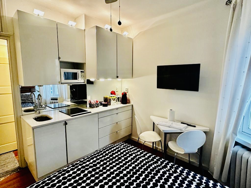 Welcome to your recently renovated city center studio apartment in Helsinki! Situated in a prime location, the stylish space is steps away from attractions, cafes, and restaurants. The building, dating back to the 1920s, boasts high ceilings and wide windowsills, adding charm. Inside, enjoy amenities like high-speed WiFi, Netflix on a 55" TV, a hairdryer, and an iron. The apartment comfortably sleeps up to four. Book your stay for a perfect urban retreat in Helsinki!