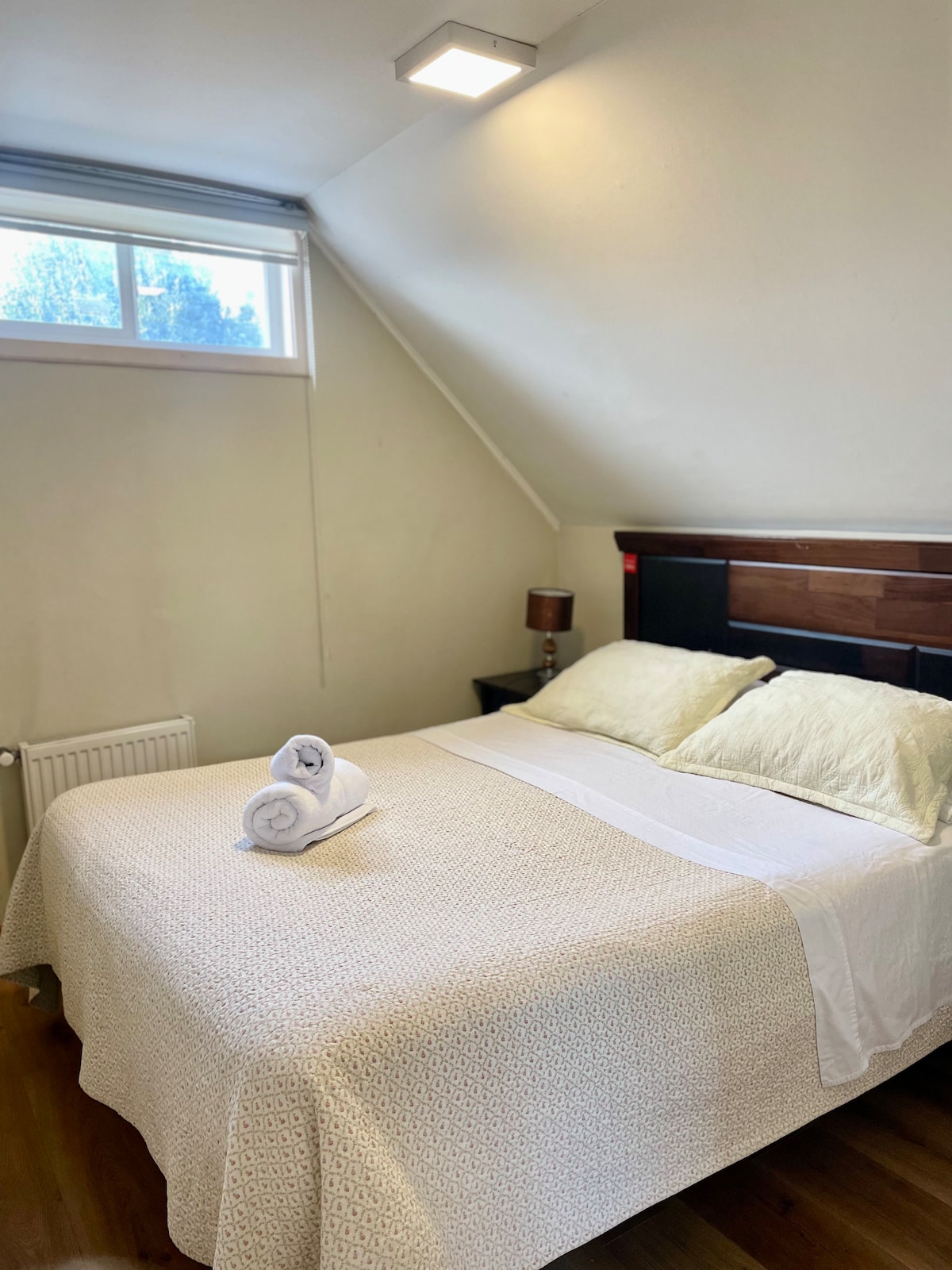 Habitación equipada en primer piso con cama matrimonial y baño privado con ducha de agua caliente, servicios de tv cable, wi-fi. Se acepta uso de espacios comunes de la casa como cocina y patio. Cuenta con estacionamiento para vehículo,, es ideal para pareja o matrimonio y está ubicada a 10 minutos del centro de Temuco.