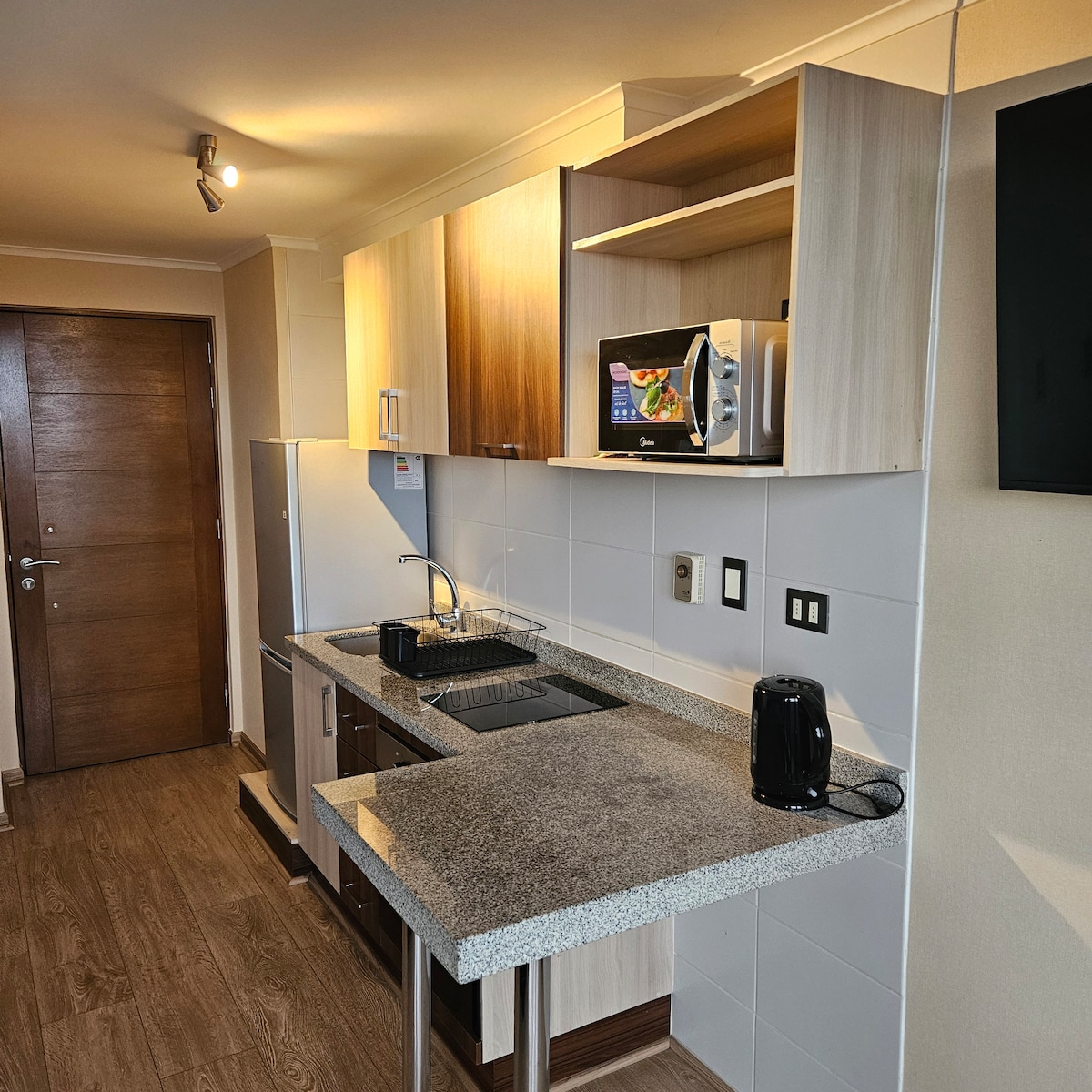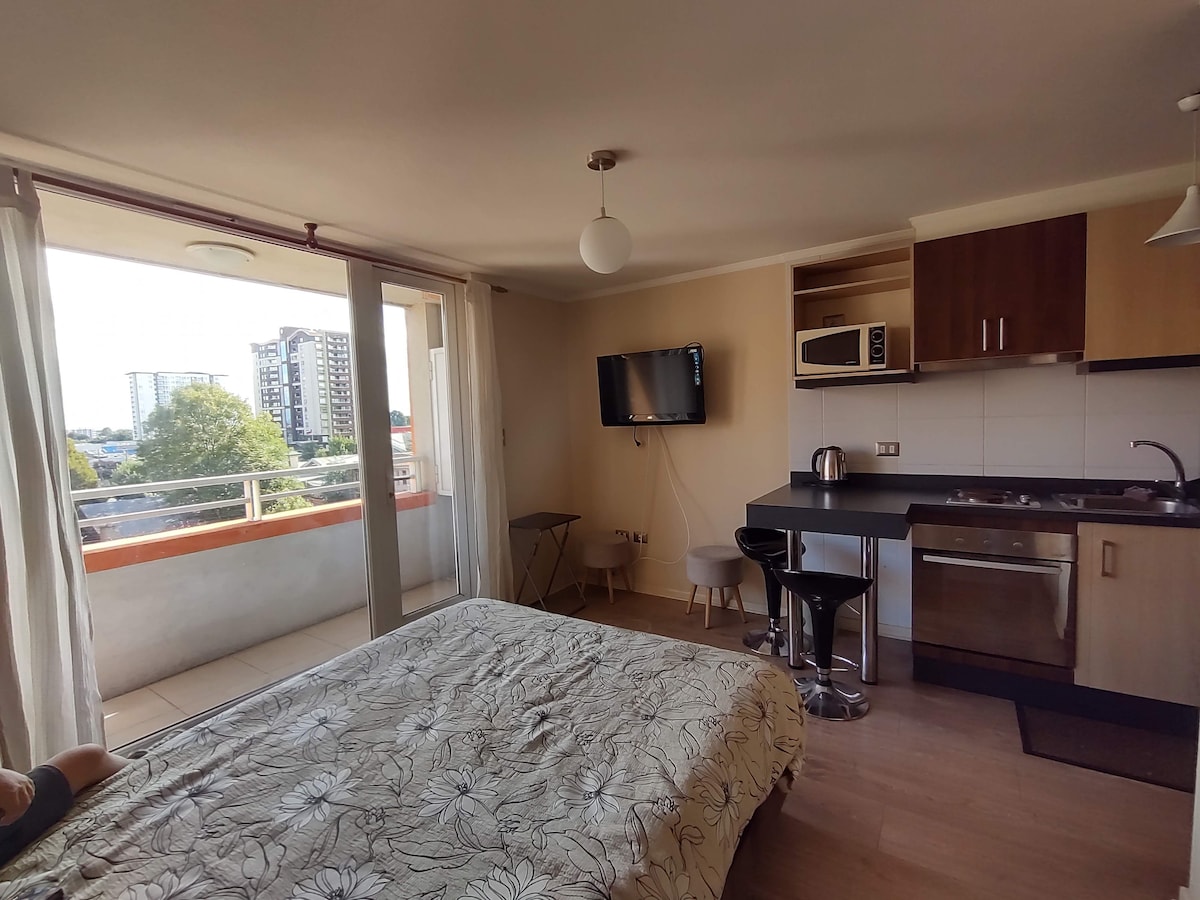 Disfruta este nuevo y moderno estudio en una de las mejores ubicaciones de Temuco. A pasos de Avenida Alemania, Mall Portal Temuco, Casino Dreams, clínicas, cafés y restaurantes, este espacio es ideal para viajes de trabajo, escapadas en pareja o estadías cortas. El departamento está completamente equipado y cuenta con wifi de alta velocidad, cama cómoda para dos personas, kitchenette funcional y un ambiente acogedor pensado para tu descanso. ¡Estrénalo tú primero!