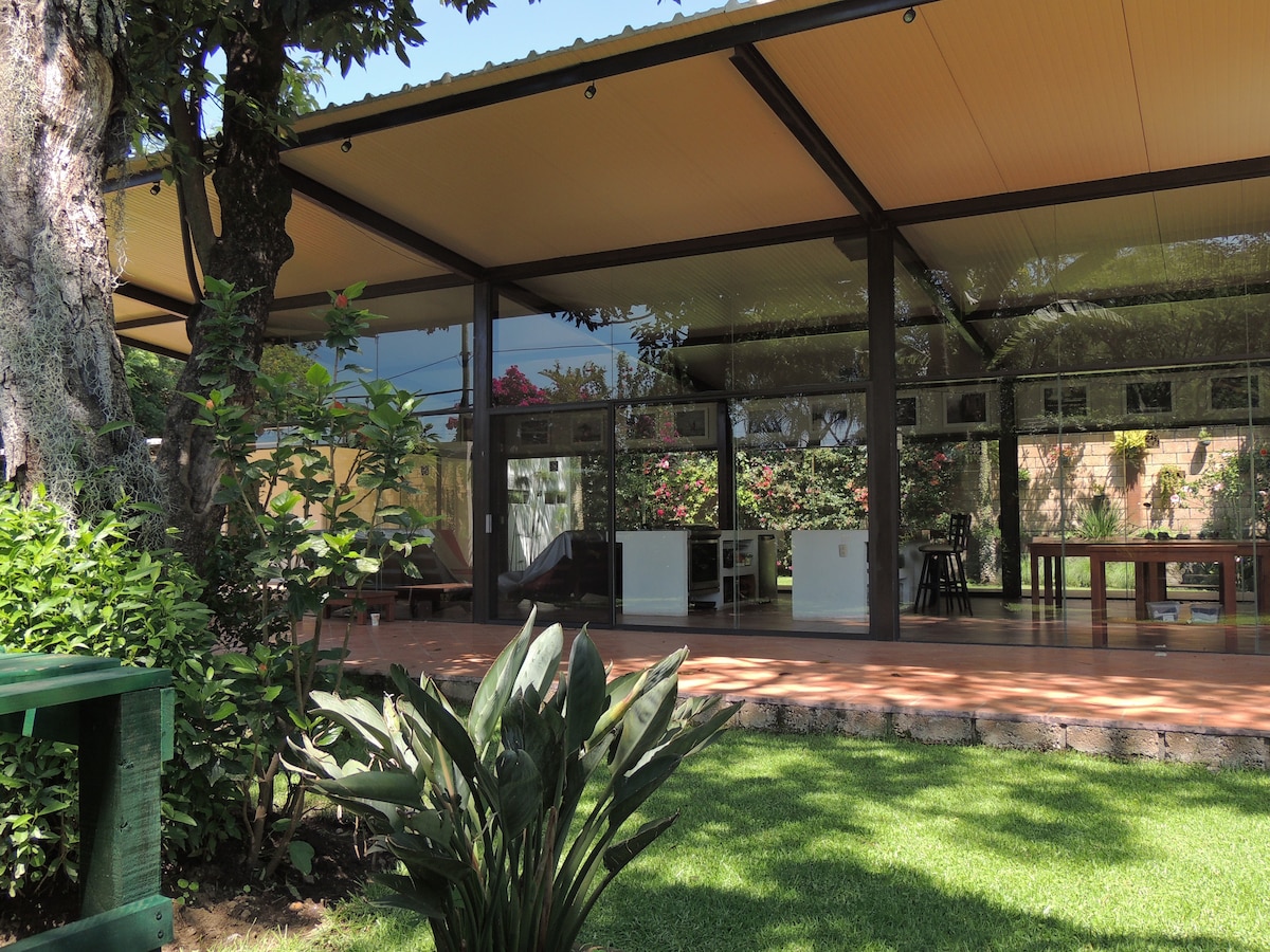 Lugar único con estilo propio. Tiene lindas vistas, una atractiva PILETA QUE SE PUEDE CLIMATIZAR SIN COSTO ADICIONAL, una agradable terraza con veranda, un cómodo comedor exterior para cuatro personas, y estacionamiento para dos autos. Recámara principal con cama queen y mesa de trabajo. Sofá-cama en la sala PARA UN ADULTO O DOS NIÑOS. Baño completo, muy cómodo. Funcional cocineta con estufa y refrigerador, así como un comedor interior para cuatro huéspedes. Ven y disfruta este gran espacio.