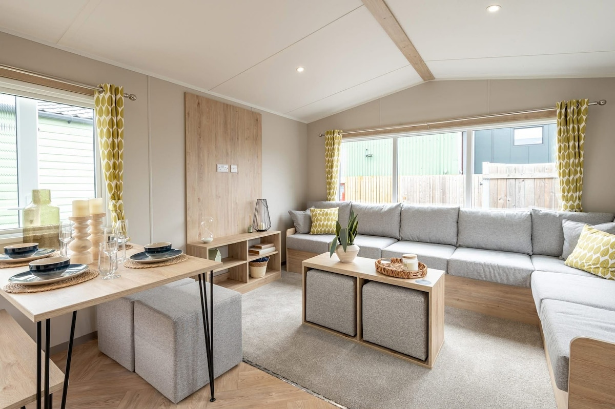 This is a luxury holiday home. A beautifully seafront property with 2 bedrooms and 2 bathrooms. Patio doors open onto a fabulous deck overlooking the sea. Central heating & double glazing makes this a wonderful place to stay during the chillier months too. Perfect for a relaxing break by the sea, watching the tides and being as one with nature. A much larger than average open plan living area. This home is over 42ft long x 14ft wide. Beach access is 2 minutes walk. Sorry there is NO WIFI