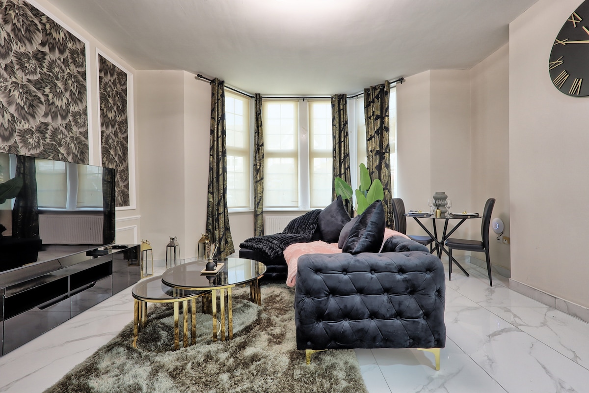 The bedroom features a stylish aesthetic, furnished with a comfortable double bed, bedside tables, and a chest of drawers in black. The flat is finished with blinds and curtains to ensure privacy at dusk. There is private on site parking for your convenience The bathroom is not shared and private for your own use Upon arrival, a set of keys will be provided for your access. We look forward to hosting you!