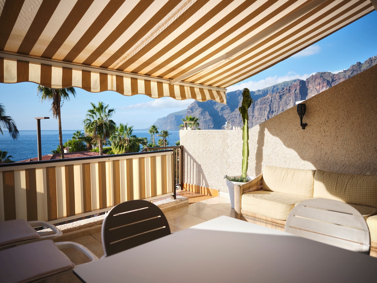 Ferienwohnung bzw. Studio in Puerto Santiago / Los Gigantes auf Teneriffa Süd. Direkt am Meer, 50 Meter von der Küste entfernt mit frontalem Meerblick vom Balkon aus. Das lichtdurchflutete Studio ist bestens ausgestattet, also Küche, Waschmaschine, Mikrowelle, Kaffeemaschine. Geräumiges Bad mit Dusche. Von dem großen Wohn-Schlaf-Küchen-Raum haben Sie Zugang zum Balkon Rtg. Meer mit direktem Meerblick vom 4. Stock aus. Aufzüge im Haus. Große Dachterrasse. Frühstücksbar gleich im Haus.