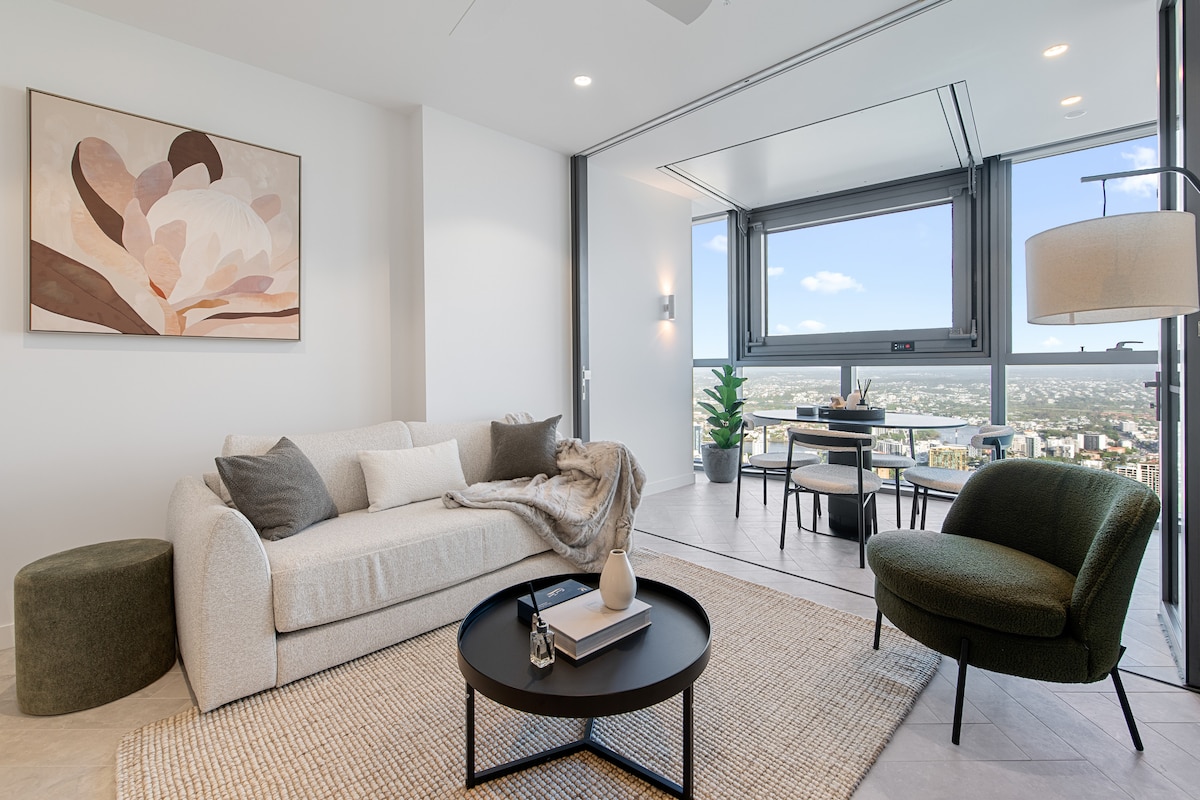 Refined and spacious, this Japanese-inspired apartment blends designer elegance with urban convenience. Nestled in Brisbane’s premier district, it’s steps from the train station, Woolworths, top-tier dining, bars, and boutique cafes. No detail has been spared - from bespoke artwork to premium amenities, inc a rooftop pool with skyline views. A sophisticated sanctuary for couples, families, or professionals. Child friendly with thoughtful extras. Experience city living with serene, stylish flair.